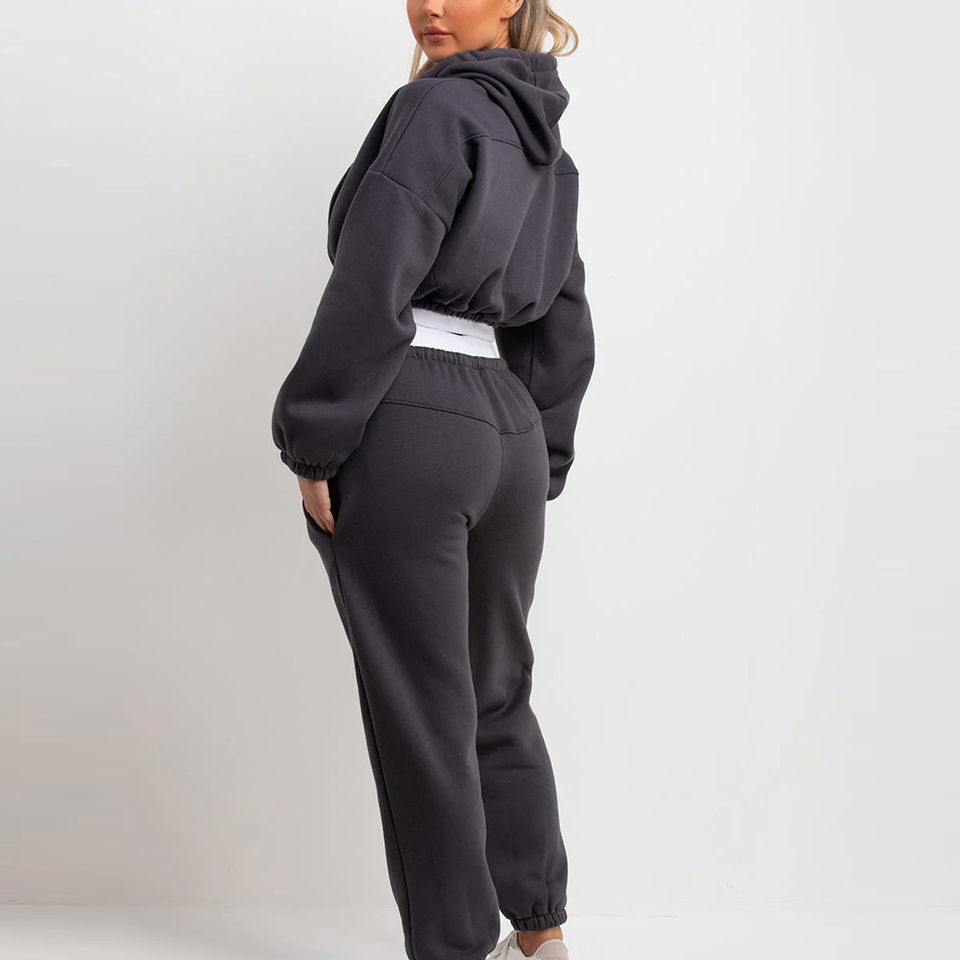 ชุดเซ็ตเสื้อครอปฮู้ดดี้โอเวอร์ไซส์ผ้าฝ้าย 100% สำหรับผู้หญิง สไตล์สตรีทแวร์ฤดูหนาว พร้อมกางเกงขายาว ชุดลำลอง 2 ชิ้น สีพื้น สามารถปรับแต่งได้