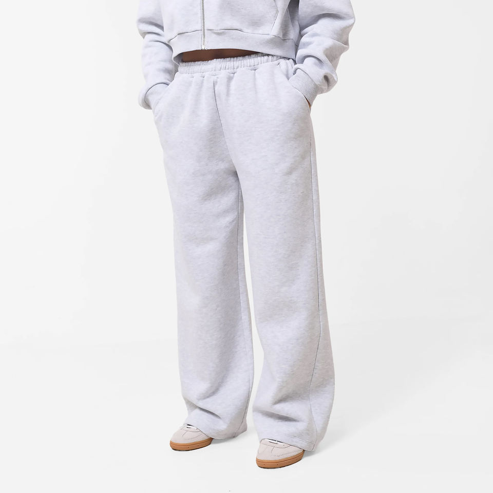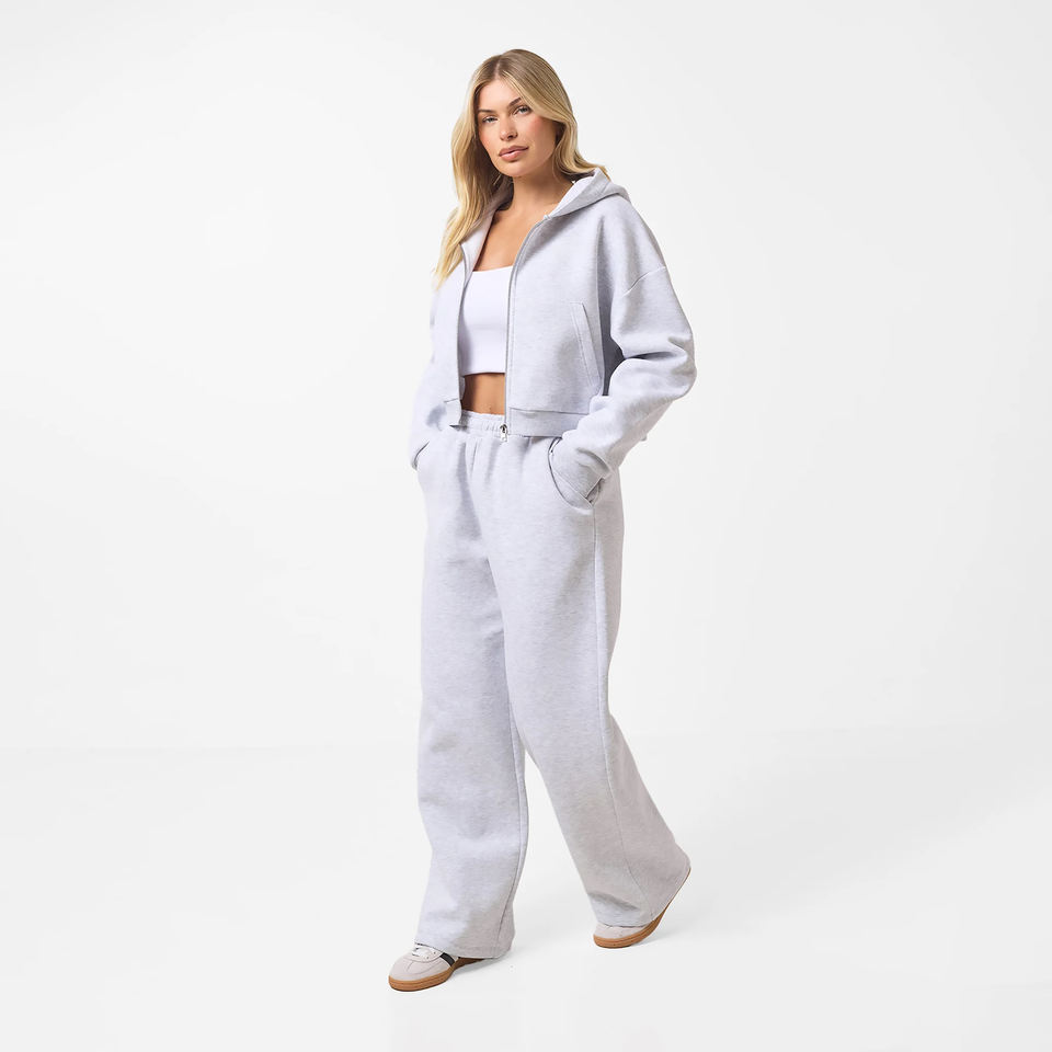 ชุดวอร์มลำลองพิมพ์ลายสำหรับผู้หญิง สีเทาเฮเธอร์ ล้างสีแบบแอซิด ผ้าฝ้าย 100% มีฮู้ด ไหล่ตก ทรงหลวม ใส่สบาย