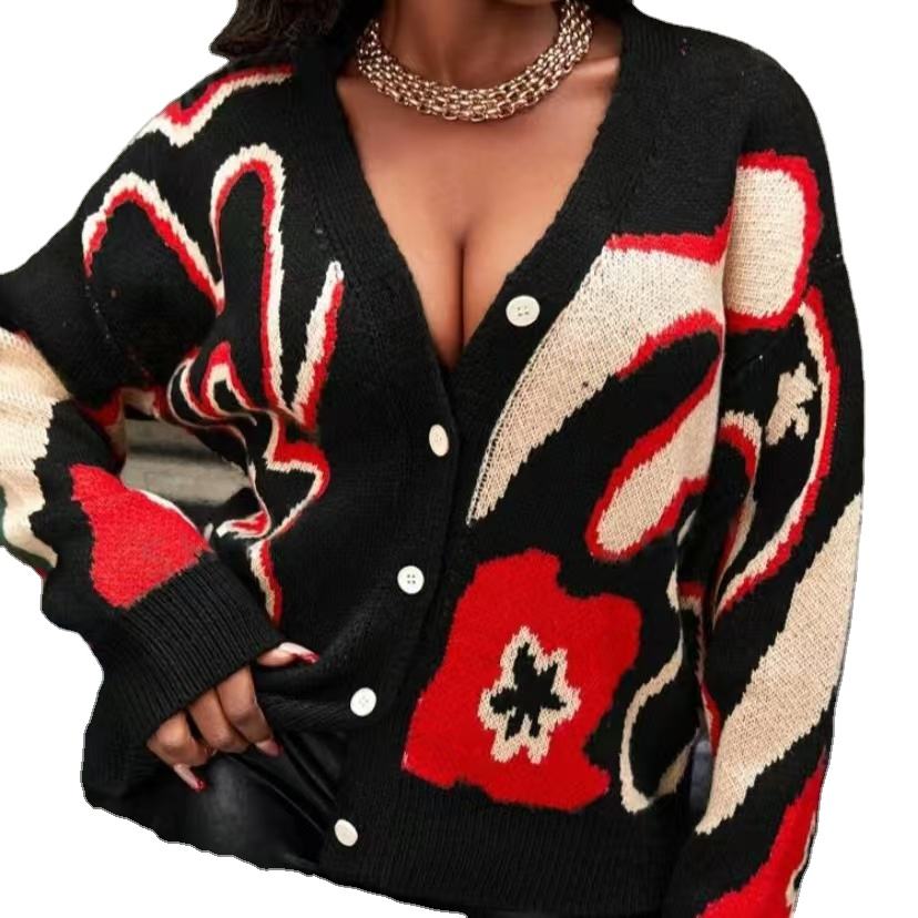 คาร์ดิแกนแขนยาวคอวีแฟชั่นสำหรับผู้หญิงเสื้อกระดุมแถวเดียวที่มีลวดลายสีทึบไม่สม่ำเสมอไอเดียสินค้าใหม่สำหรับฤดูหนาว
