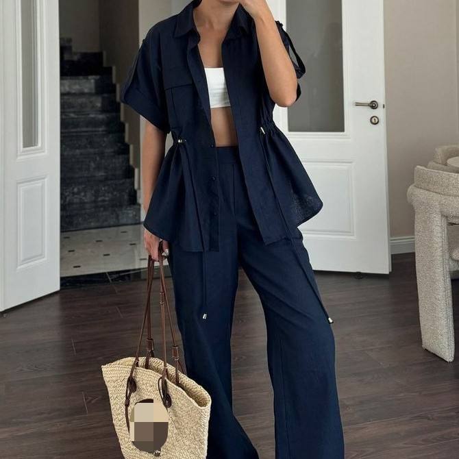 ชุดทำงานสไตล์ลำลองสำหรับผู้หญิง เสื้อแขนสั้นมีกระเป๋าแบบรูดเชือกและกางเกงขายาว ชุดเซ็ต 2 ชิ้น แฟชั่น