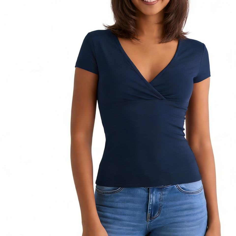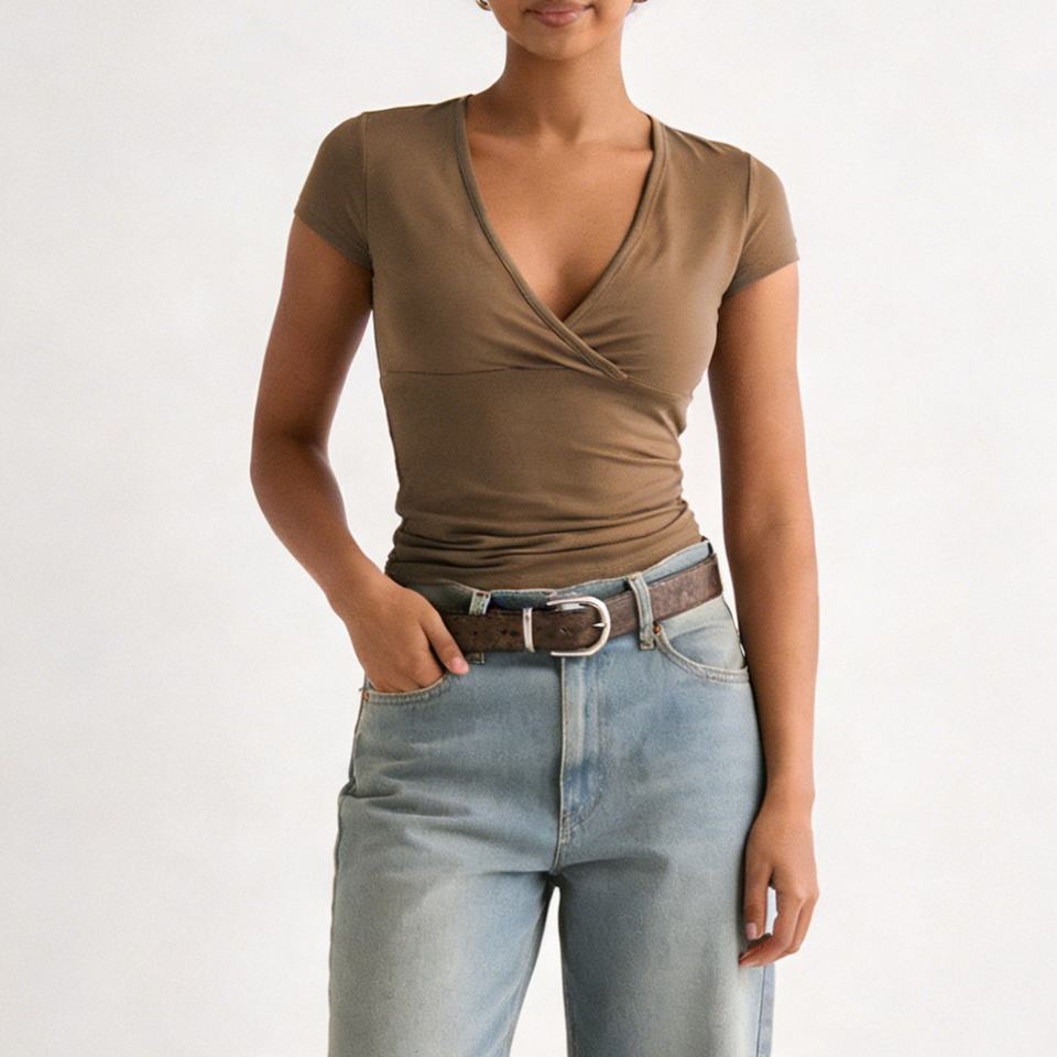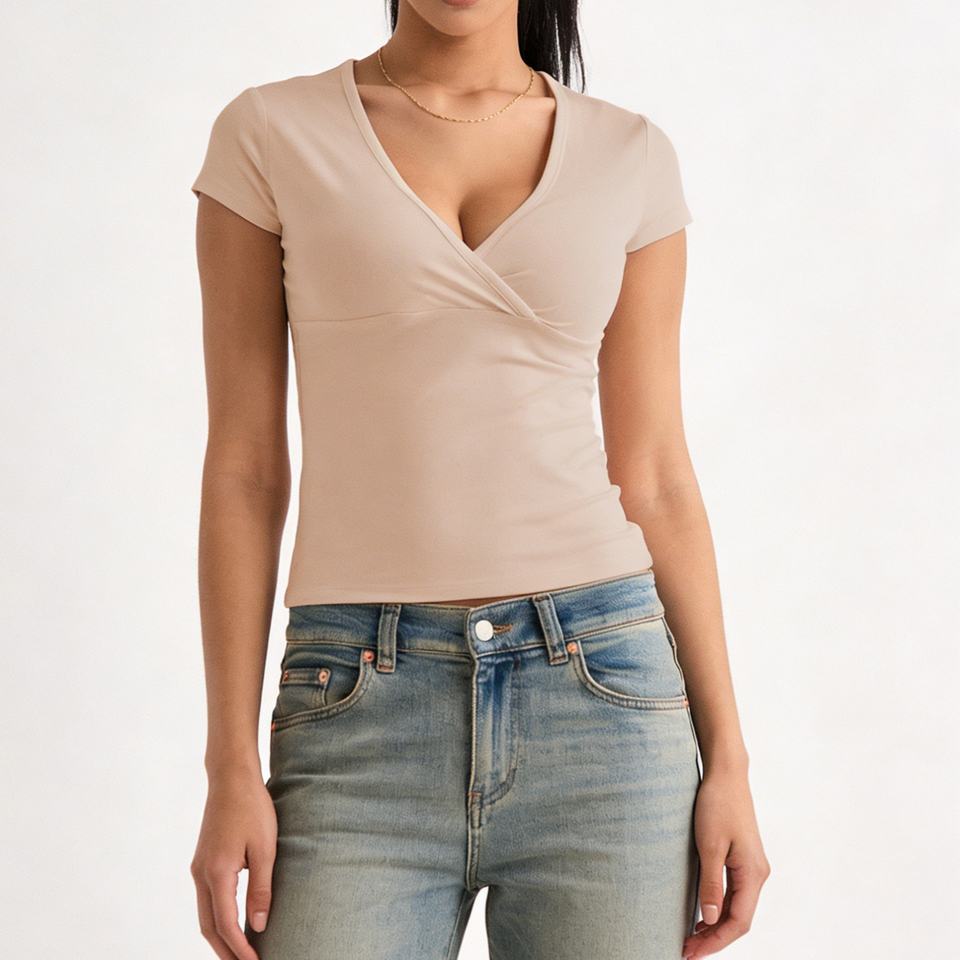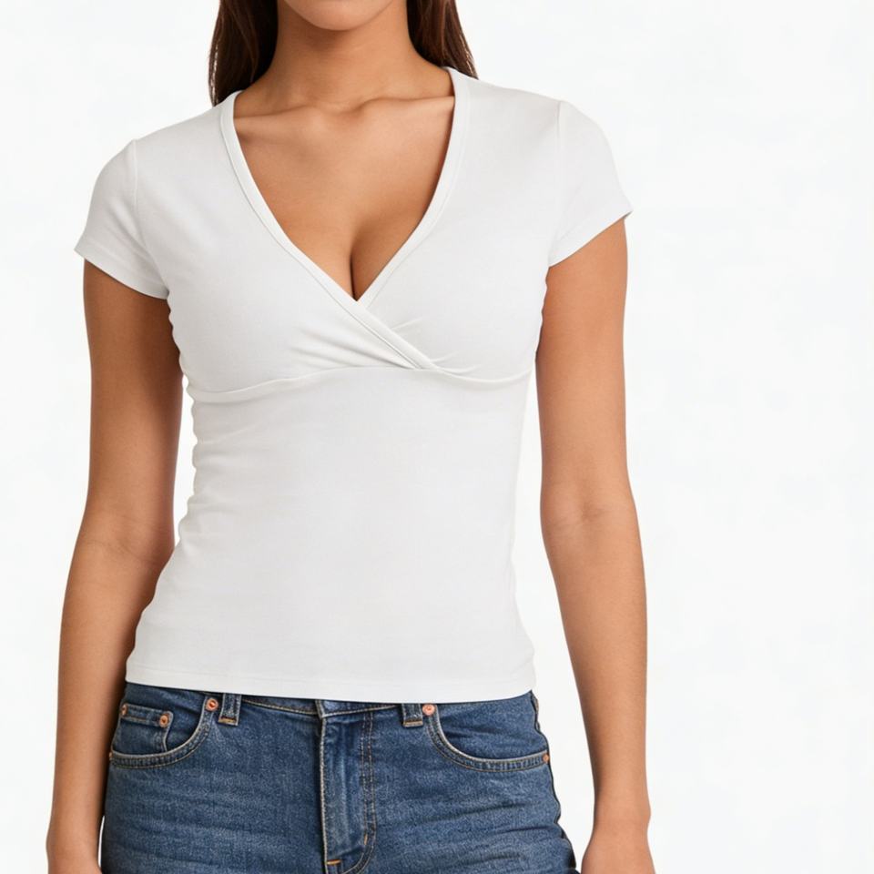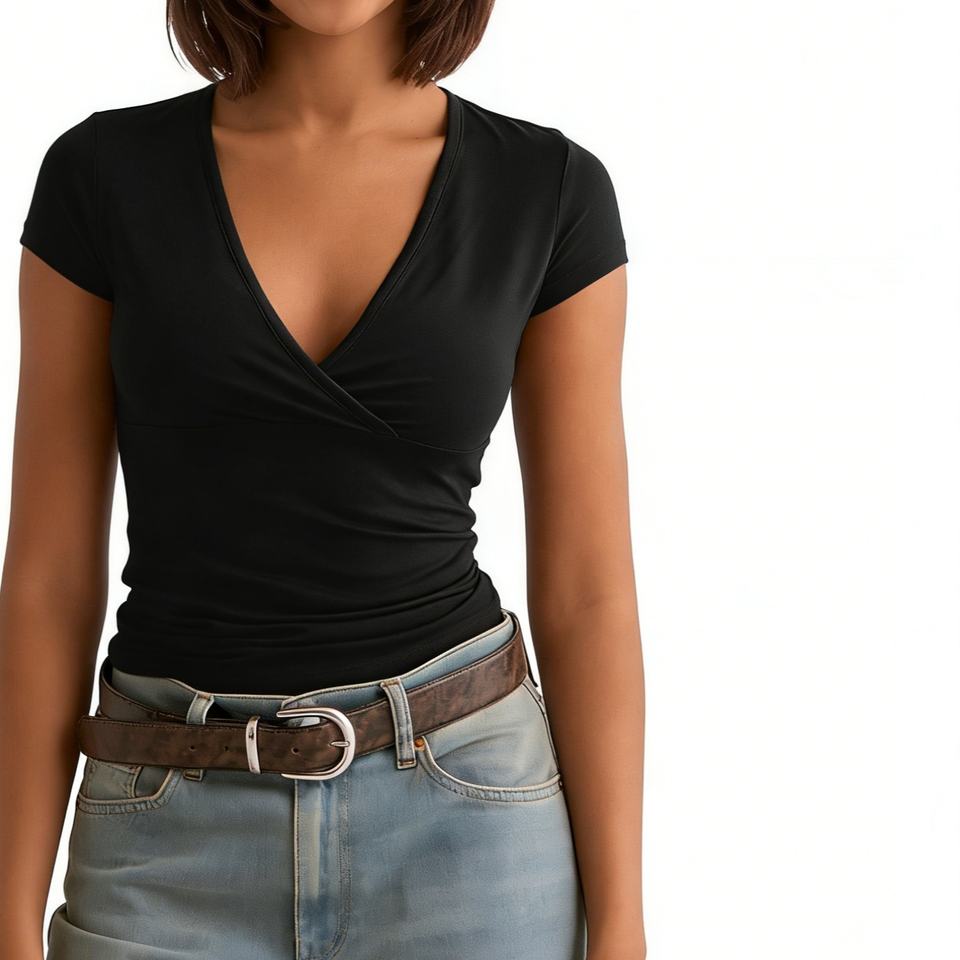 เสื้อคอวีแบบพันด้านหน้าสำหรับผู้หญิง - เสื้อยืดแขนสั้นทรงรัดรูปแฟชั่น