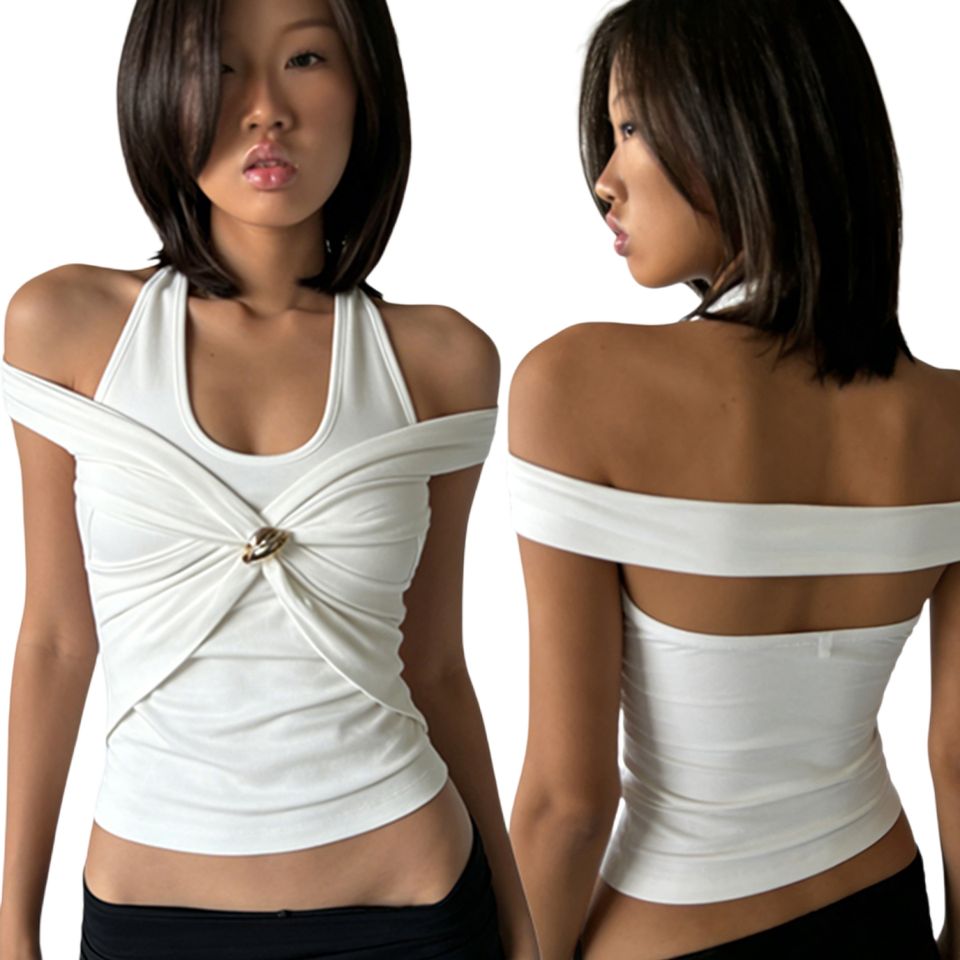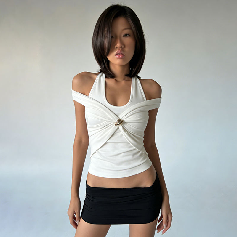 เสื้อยืดแขนสั้นผู้หญิงสไตล์ Y2K ระบายอากาศได้ดี สีพื้น ทรงปกติ ดีไซน์ผูกปมเว้าช่วงตัว เหมาะสำหรับใส่ในฤดูร้อน