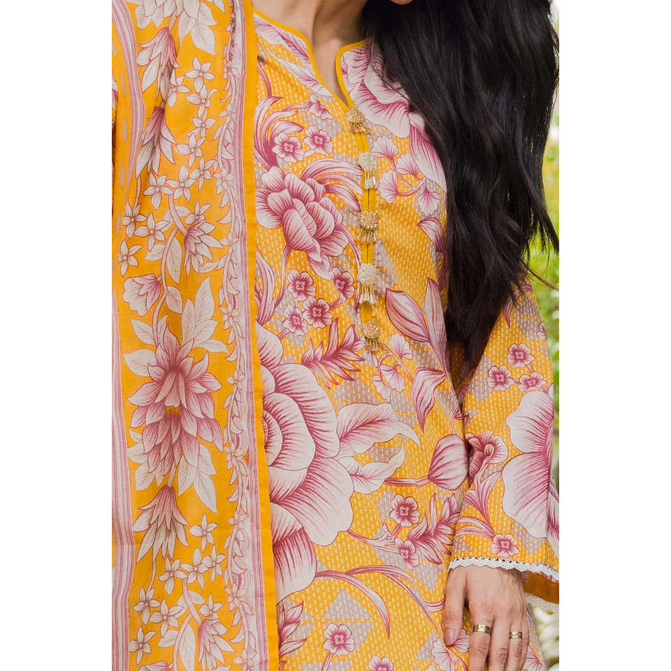 ชุดผ้าลอนสีเหลืองสำหรับผู้หญิง 3 ชิ้น แบบยังไม่เย็บติดกัน ลายพิมพ์ดิจิทัล ทำจากผ้ามัสลิน