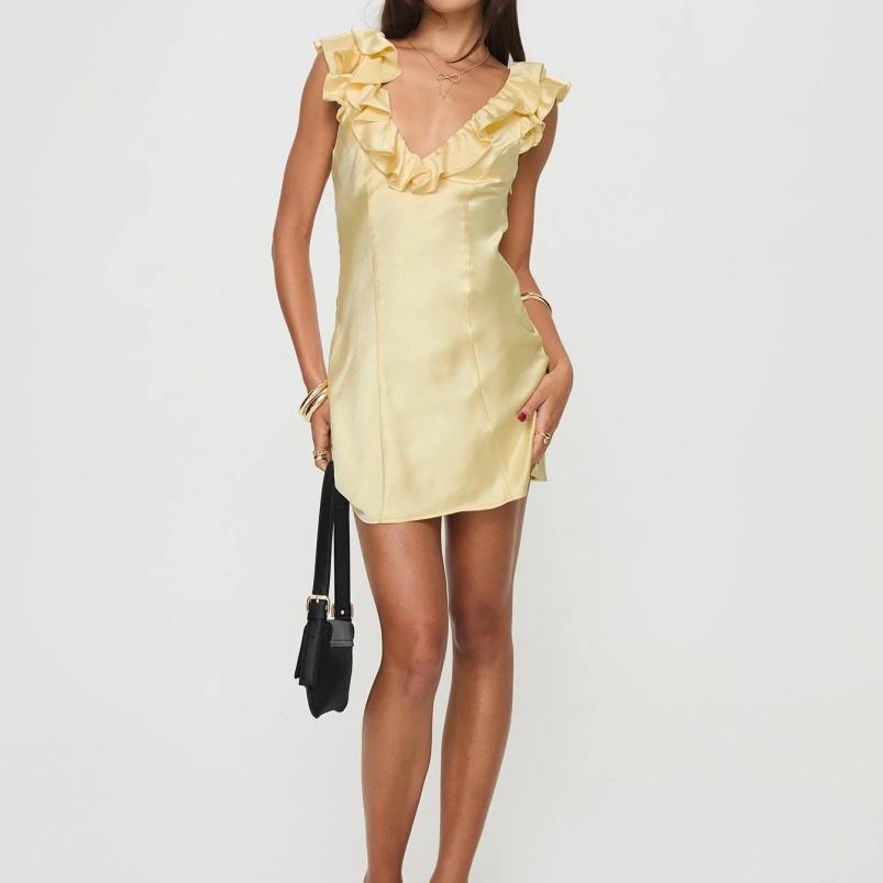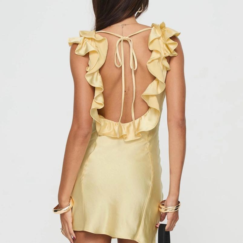เดรสมินิเดรสลำลองคอวีเว้าหลังสีเหลืองของผู้หญิงผ้าชีฟองสีพื้นเอวธรรมชาติแบบทอและซักได้
