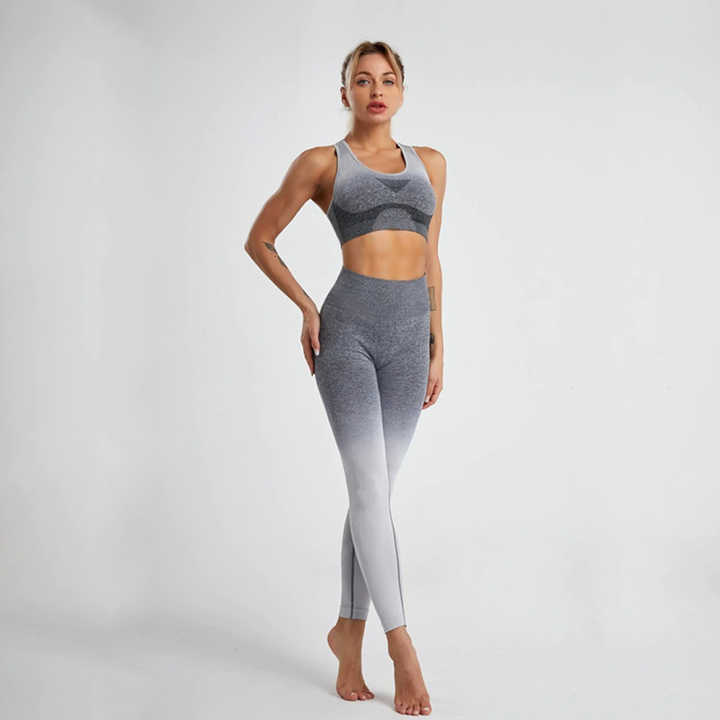 ชุดโยคะผู้หญิงแบบ 2 ชิ้น เสื้อชั้นในแบบ Racerback ไร้สายหลัง และกางเกงเลกกิ้งยาวถึงข้อเท้า ระบายอากาศได้ดี ปรับแต่งโลโก้และขนาดได้