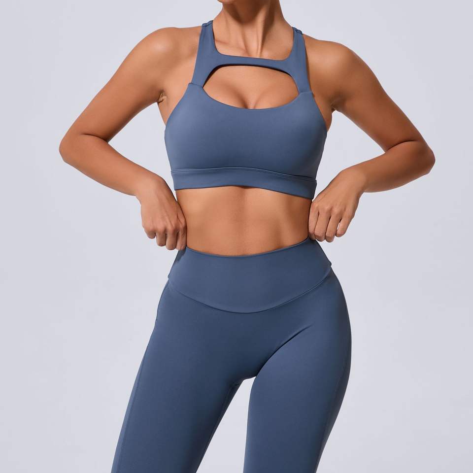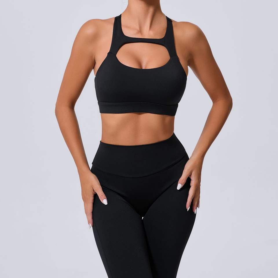 บราเล่นกีฬาโยคะของผู้หญิงดีไซน์เซ็กซี่แบบคัตเอาต์สีทึบผ้าซับเหงื่อระบายอากาศได้ดีเป็นมิตรต่อสิ่งแวดล้อม