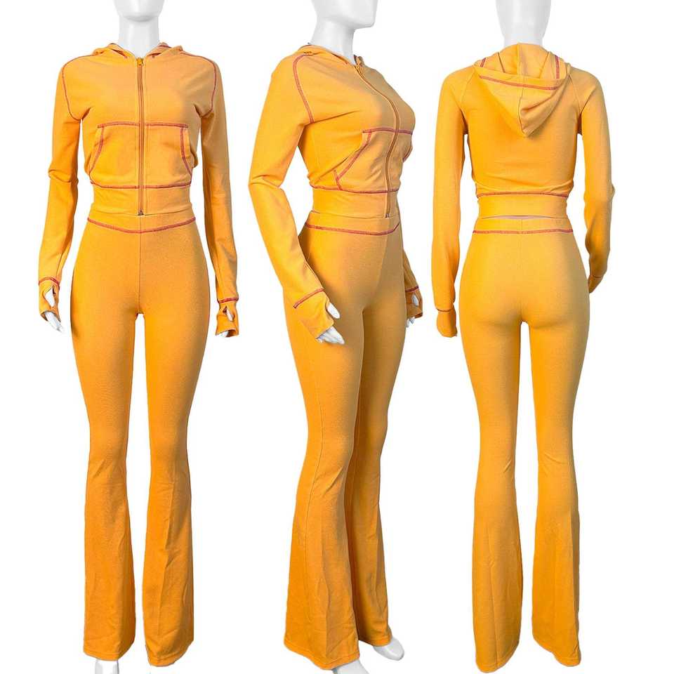 เสื้อฮู้ดครอปซิปสำหรับผู้หญิงและกางเกงขาบาน ชุดลำลองสองชิ้นสำหรับฤดูหนาว ผ้าเนื้อนุ่ม ใส่สบาย ทรงปกติ สไตล์สตรีท