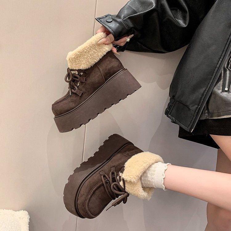 รองเท้าบูทส้นแบนแฟชั่นสำหรับผู้หญิง บุขนด้านใน พื้นหนาเพิ่มความสูง พร้อมคุณสมบัติกันลื่น สไตล์ลำลองอเนกประสงค์