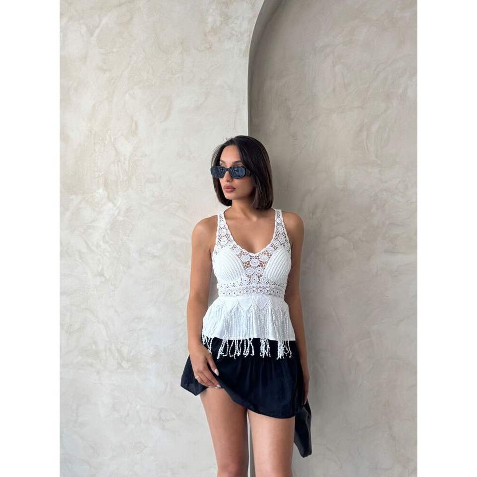 เสื้อผู้หญิงแบบมีสายรัดประดับลูกไม้สีครีม ขายส่งเสื้อแฟชั่น