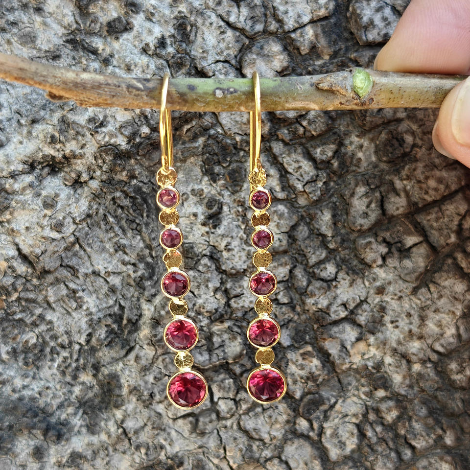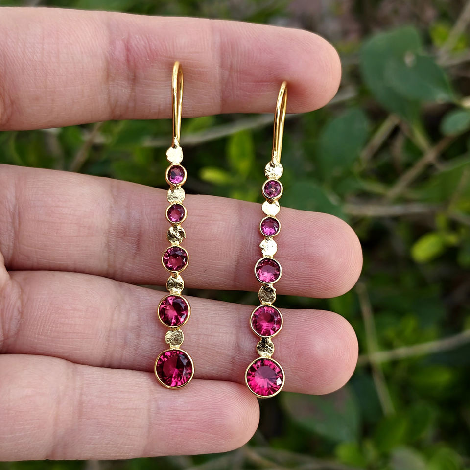 ต่างหูห้อยระย้าทรงยาวประดับพลอยหลายชนิด ทั้งทับทิมและควอตซ์ทรงกลม ชุบทองคำ 18k สำหรับผู้หญิง