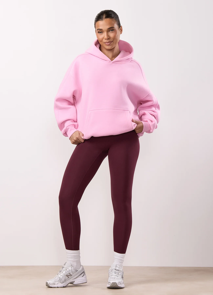 ชุดเซ็ตสองชิ้น เสื้อฮู้ดดี้ขนแกะสีชมพูโอเวอร์ไซส์สำหรับผู้หญิง พร้อมเลกกิ้งสีน้ำตาลแดงด้านหน้า เหมาะสำหรับออกกำลังกาย โยคะ ท่องเที่ยว ใส่ลำลองในฤดูหนาว