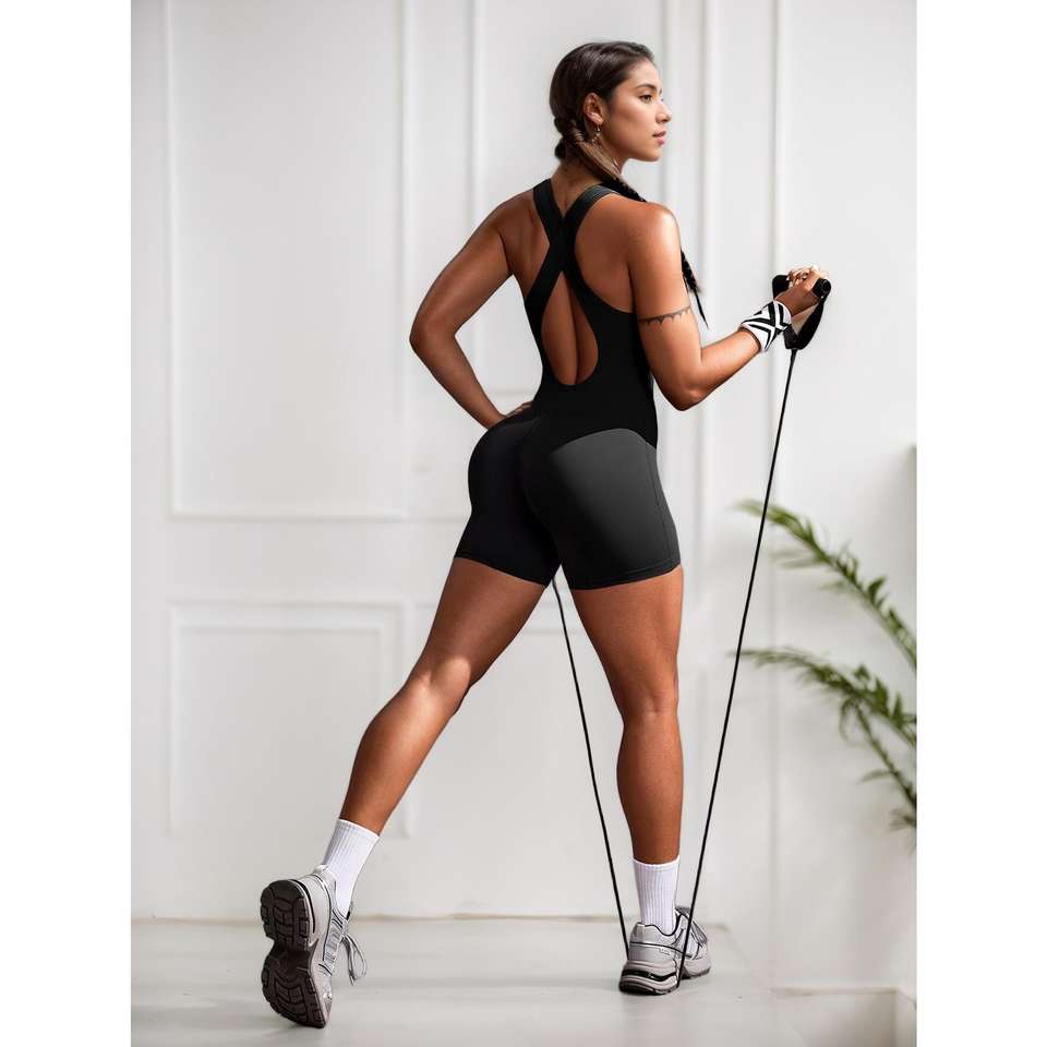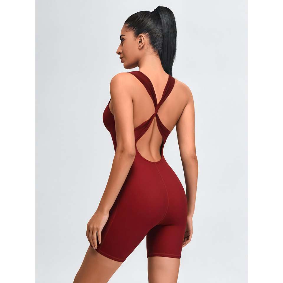 กางเกงจั๊มสูทขาสั้นสำหรับผู้หญิง ดีไซน์ไขว้ด้านหลัง เหมาะสำหรับวิ่ง โยคะ และกีฬาต่างๆ