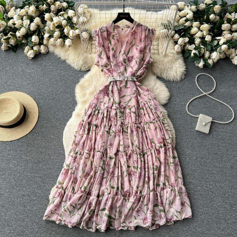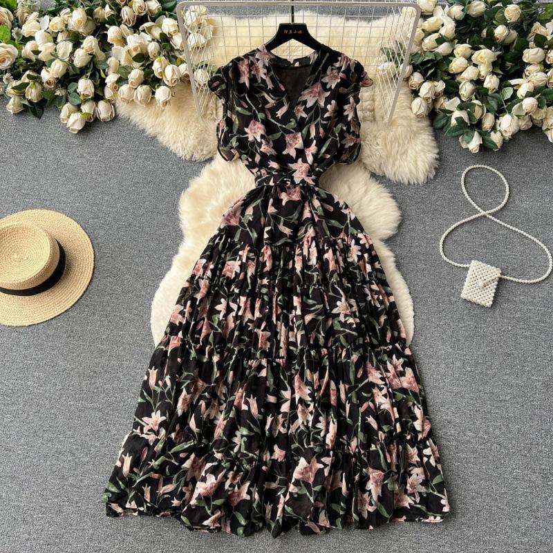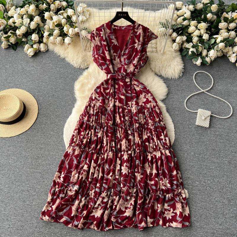 เดรสยาวลายดอกไม้สไตล์วินเทจฝรั่งเศสสำหรับผู้หญิง แขนกุด คอปก ลำลอง หรูหรา เหมาะสำหรับงานปาร์ตี้ ชายหาด ฤดูร้อน