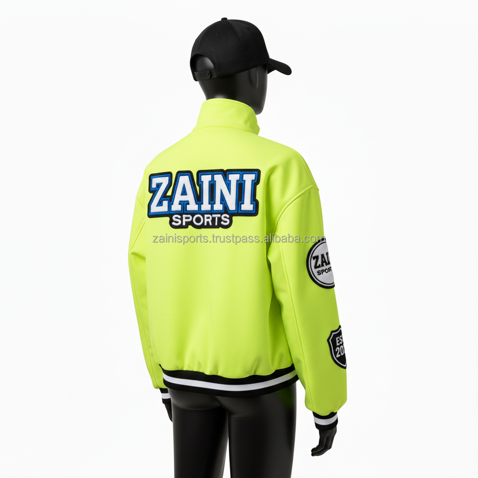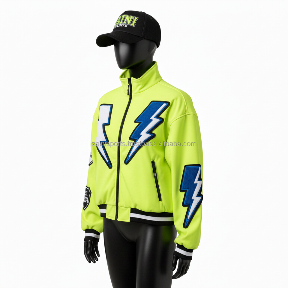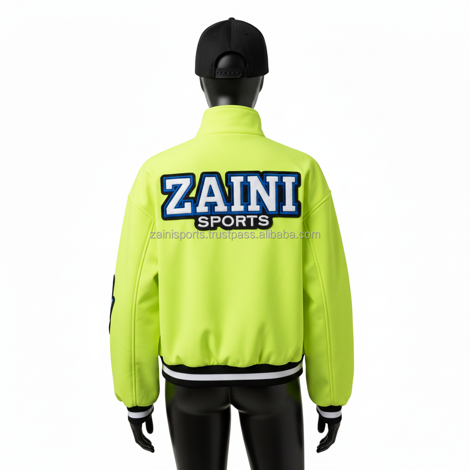 เสื้อแจ็คเก็ตซอฟต์เชลล์ผู้หญิง สีเขียวนีออน ผ้าโพลีเอสเตอร์พรีเมียม ยืดหยุ่น ระบายอากาศ โลโก้ลายเชนิลล์แบบกำหนดเอง เสื้อแจ็คเก็ตซอฟต์เชลล์ผู้หญิง