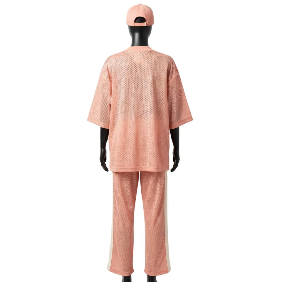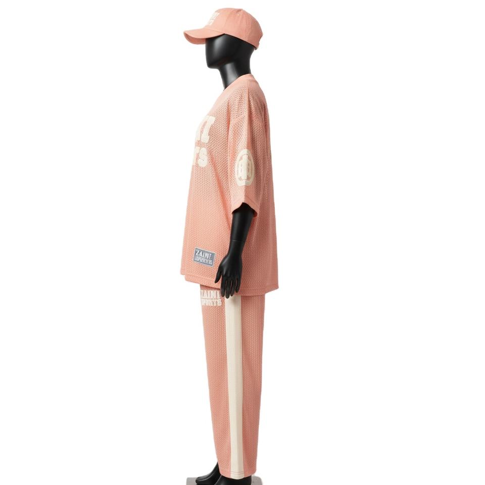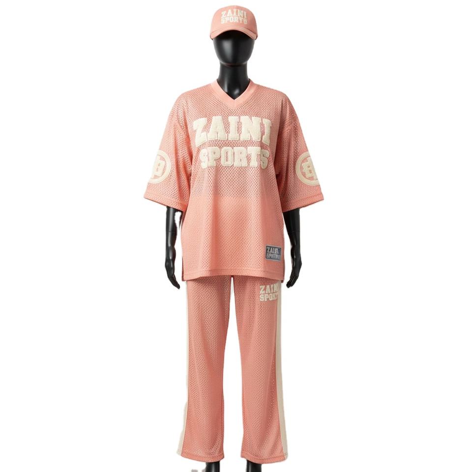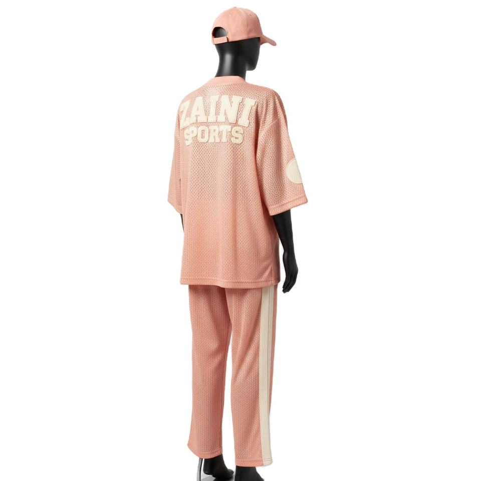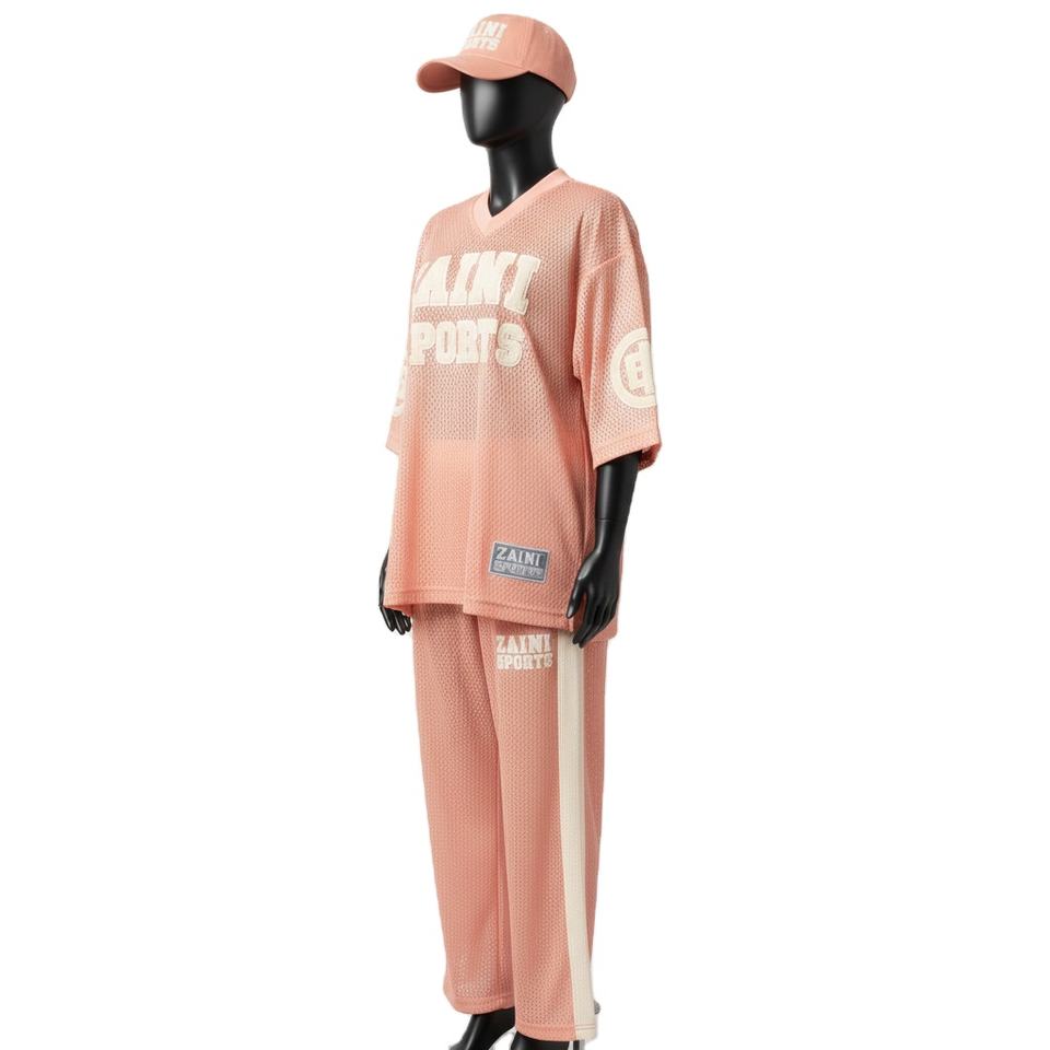 ชุดกีฬาผู้หญิงแบบ 2 ชิ้น ผ้าโพลีเอสเตอร์คุณภาพสูง ระบายอากาศได้ดี สีพีชอ่อน แต่งแผงสีตัดกัน พร้อมปักโลโก้ตามสั่ง