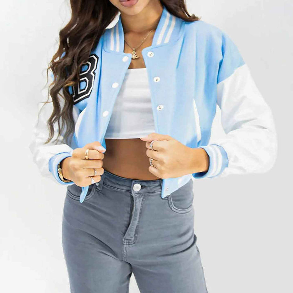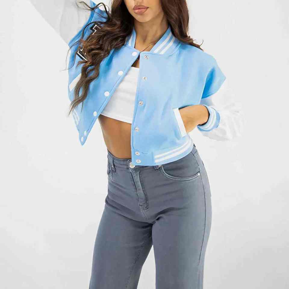 เสื้อแจ็คเก็ตวาร์ซิตี้สำหรับผู้หญิง สวมใส่ได้ทุกวัน มาพร้อมกระดุมแป๊ก ผ้าริบเนื้อนุ่มสบาย เหมาะสำหรับลุคสตรีทแวร์แบบสบายๆ และกำลังลดราคา