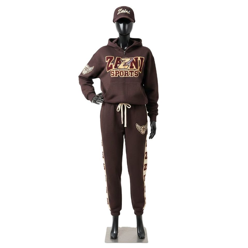 ชุดวอร์มผู้หญิงสำหรับฤดูหนาว ผ้าฟลีซหนานุ่ม ผสมผ้าฝ้ายและโพลีเอสเตอร์ ผ้าขัดเนื้อนุ่ม สีน้ำตาล มีแถบข้าง รับสกรีนโลโก้ ชุดวอร์มไซส์ใหญ่