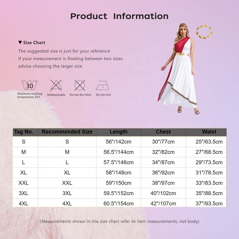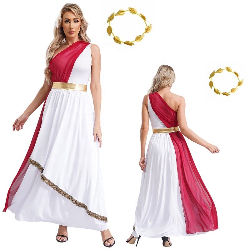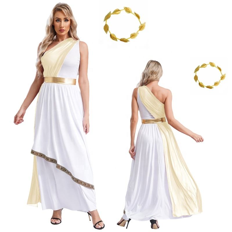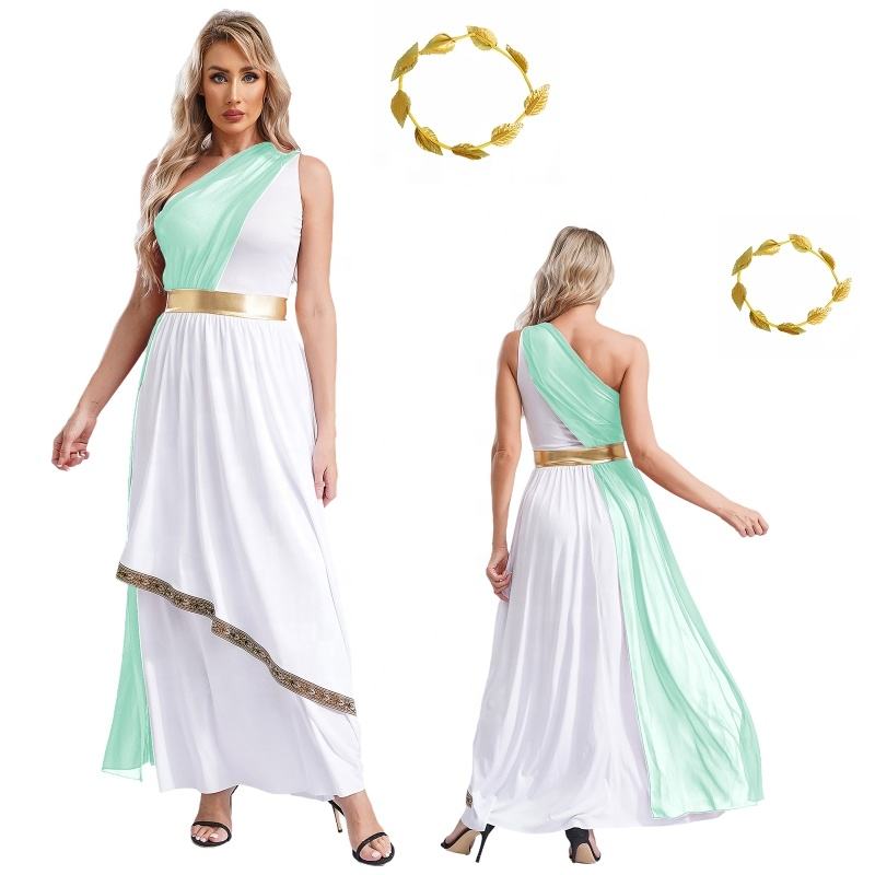 ชุดเดรสกรีกโบราณสำหรับสตรีพร้อมพวงมาลัยใบไม้เทียมชุดปาร์ตี้คอสเพลย์การแสดงบนเวทีชุดเต้นรำ