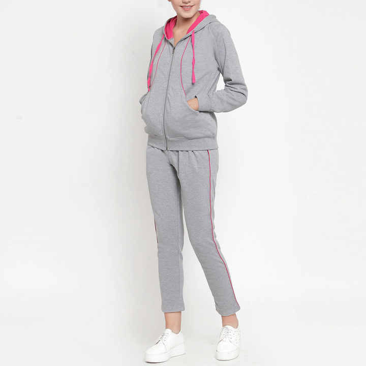 ชุดวอร์มผู้หญิงสำหรับฤดูใบไม้ร่วง ผ้าฟลีซเนื้อนุ่ม ระบายอากาศได้ดี เป็นมิตรต่อสิ่งแวดล้อม ชุดลำลองมีฮู้ด ซิปหน้า กางเกงจ็อกเกอร์ ผลิตจากโพลีเอสเตอร์/คอตตอน