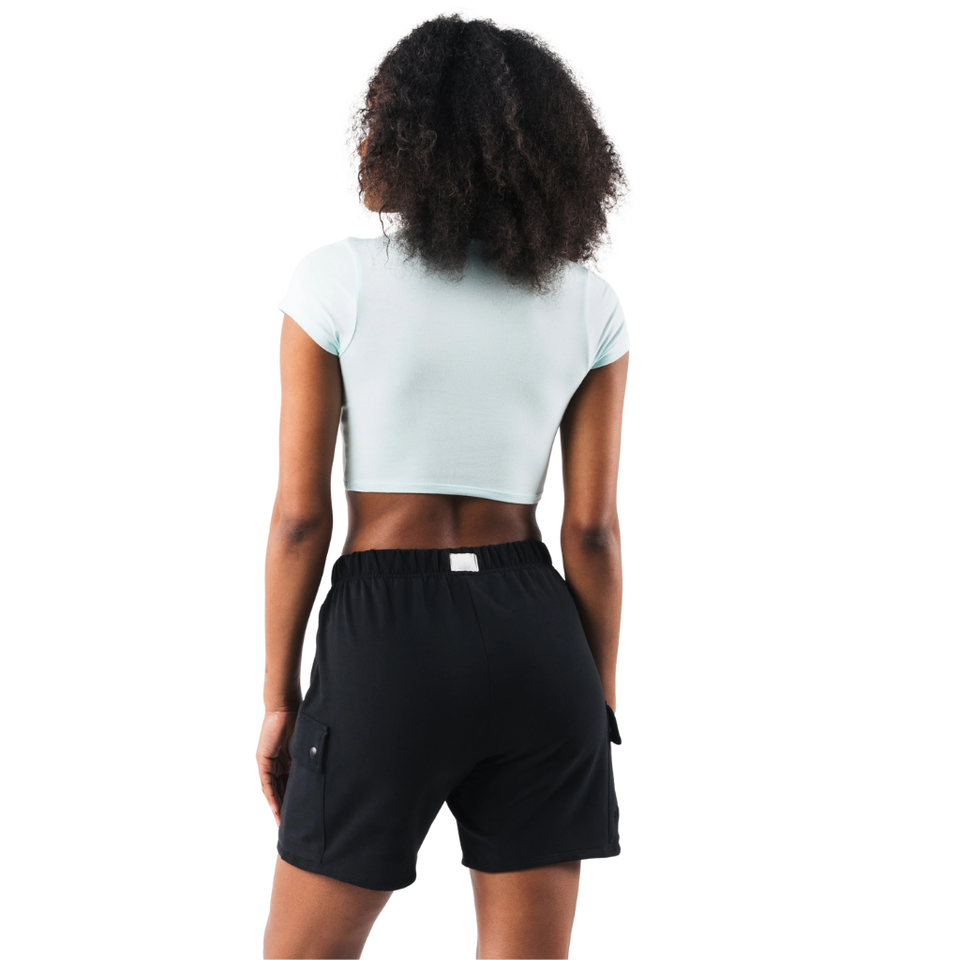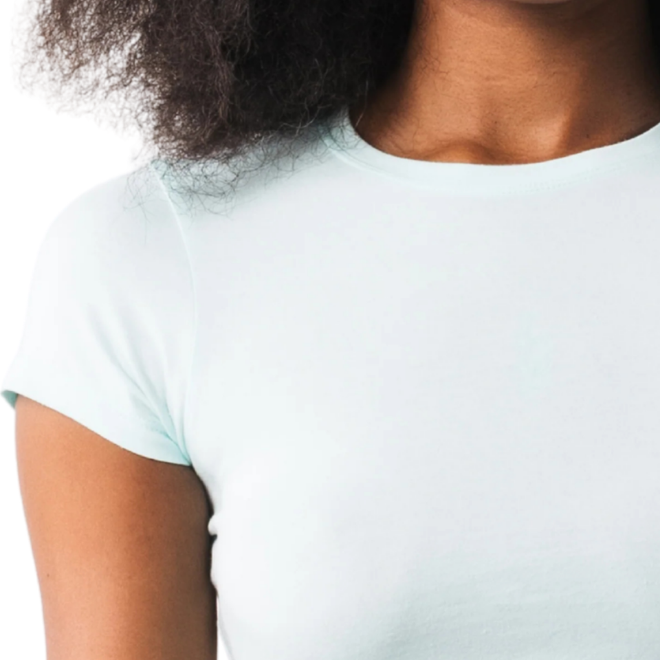 เสื้อครอปท็อปผู้หญิง สีฟ้าอ่อน เนื้อผ้านุ่ม ยืดหยุ่นได้ แขนสั้น เหมาะสำหรับออกกำลังกาย โยคะ ฟิตเนส ชุดกีฬา