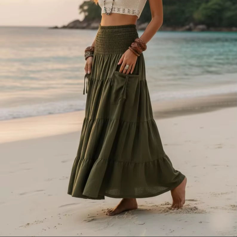 กระโปรงแม็กซี่ชายหาดสำหรับผู้หญิง ผ้าฝ้ายออร์แกนิค ทรงระบายหลายชั้น พลิ้วไหว สไตล์โบฮีเมียน กระโปรงยาวสำหรับฤดูร้อน ชุดเดรสยาวสำหรับฤดูร้อน