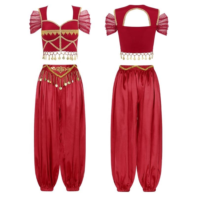 ชุดเต้นระบำหน้าท้องสำหรับสตรีชุดครอปพร้อมกางเกงบลูมเมอร์ผ้าซาตินสำหรับการแสดงบนเวทีชุดงานปาร์ตี้งานเต้นรำสวมหน้ากาก
