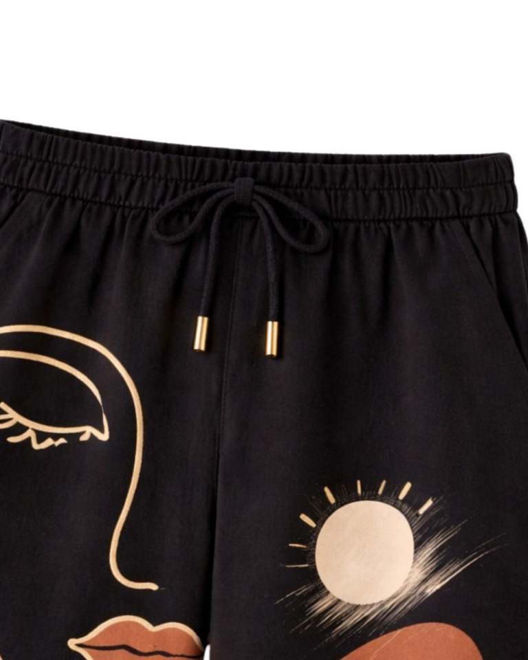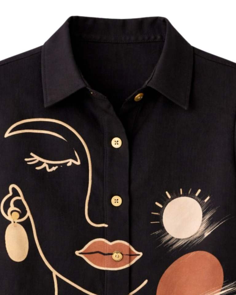 ชุดเซ็ตสองชิ้นลายพิมพ์หน้าคนแบบนามธรรมสีดำสำหรับผู้หญิง เสื้อเชิ้ตแขนสั้นติดกระดุมพร้อมกางเกงขายาวทรงกว้าง สไตล์ลำลองสำหรับฤดูร้อน ลายศิลปะ