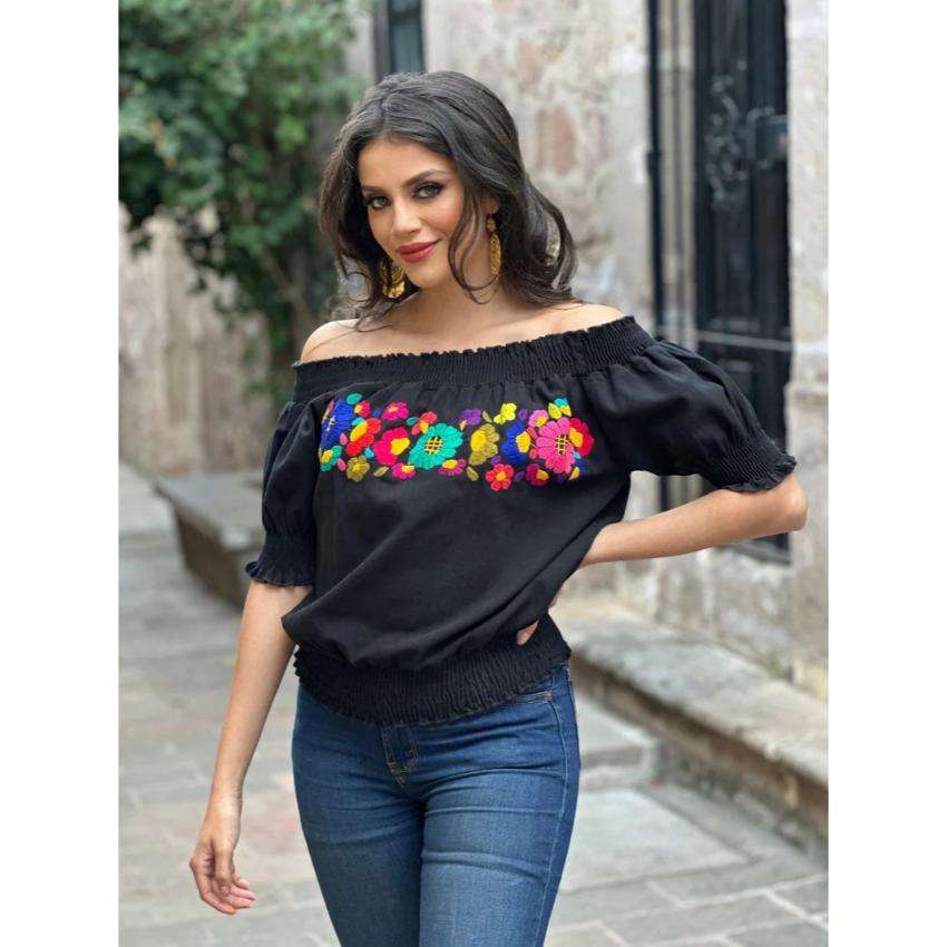 Womens Black Embroidered Off Shoulder Blouse Floral Mexican Boho Top Cotton Casual Summer Ladies Top