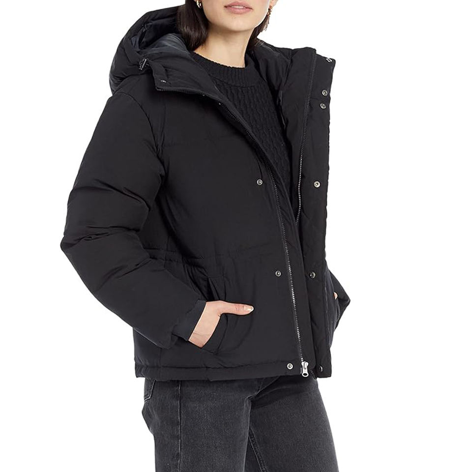 แจ็กเก็ตขนเป็ดมีฮู้ดสีดำของผู้หญิงเสื้อนอกบุสองชั้นแบบมีซิปสามารถปรับสายรัดเอวได้สำหรับฤดูหนาว