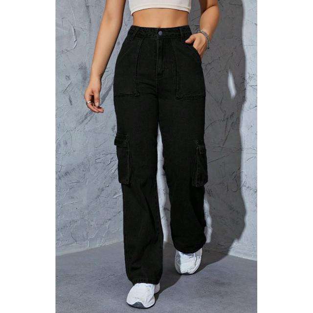 Womens Black Y2K Cargo Jeans High Waist Regular Fit Durable Stretch Eco-Friendly Plating Multi Pocket Lifestyle Streetwear Sizes