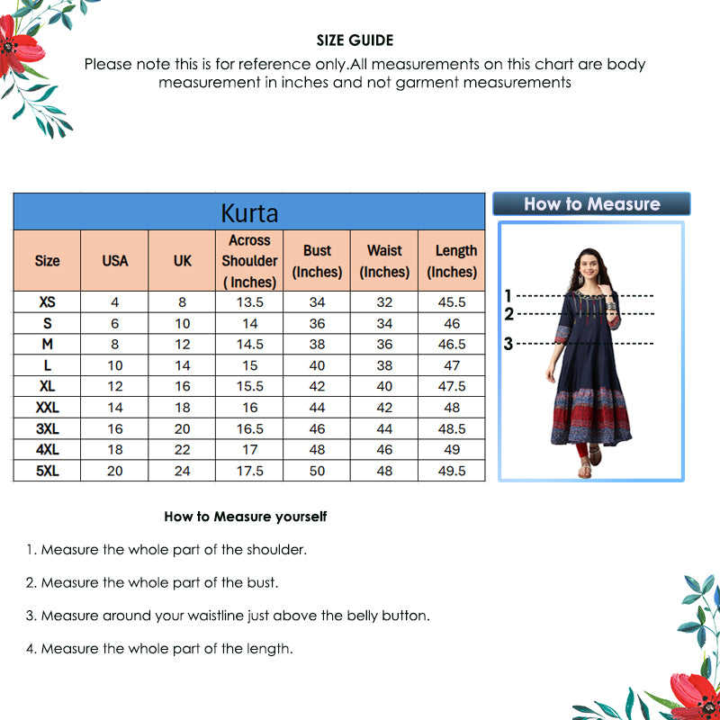 ชุดอานาร์กาลีคุรตะผ้าฝ้ายสีน้ำเงินปักลายสำหรับผู้หญิง คอทรงกลม แขนสามส่วน ออกแบบมาเพื่อการสวมใส่ในงานเทศกาลชาติพันธุ์ต่างๆ ทั่วโลก