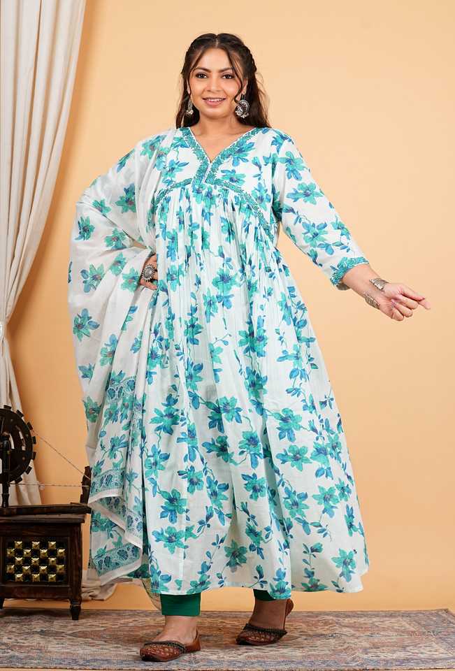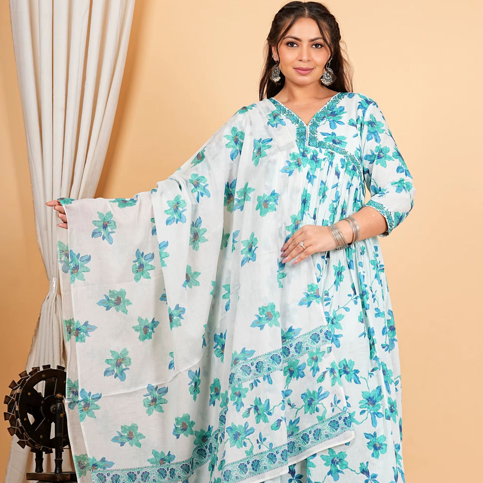 ชุดอานาร์กาลีคุรตะผ้าฝ้ายสีน้ำเงินพิมพ์ลายดอกไม้สำหรับผู้หญิง คอวี ปักลาย แขนสามส่วน ออกแบบมาเพื่อการสวมใส่แบบชาติพันธุ์ทั่วโลก
