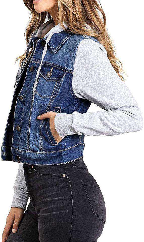 เสื้อแจ็คเก็ตยีนส์สีน้ำเงินแบบครอปสำหรับผู้หญิง แขนยาว บุด้วยผ้าฝ้ายและขนสัตว์ มีกระเป๋าด้านหน้า (ขายส่ง)