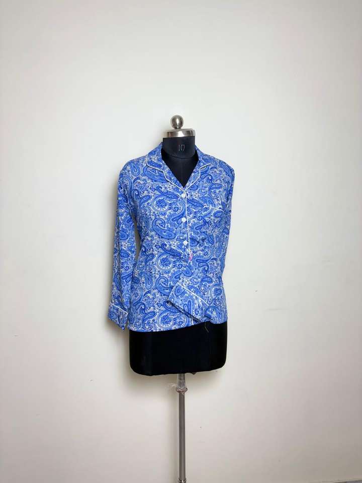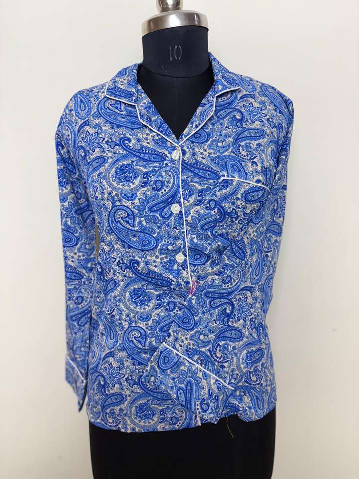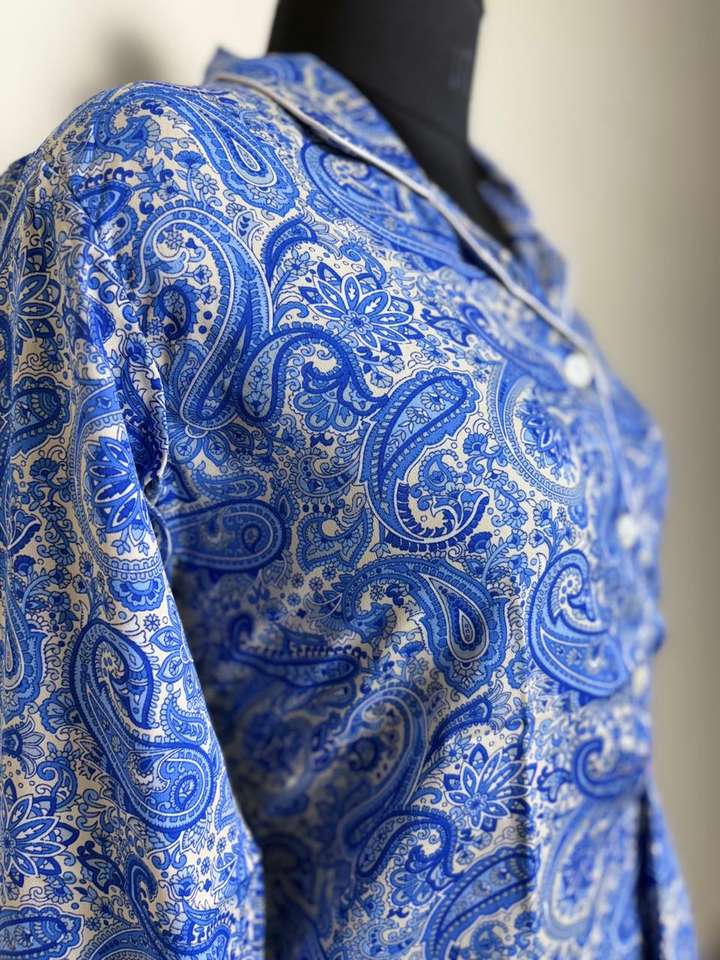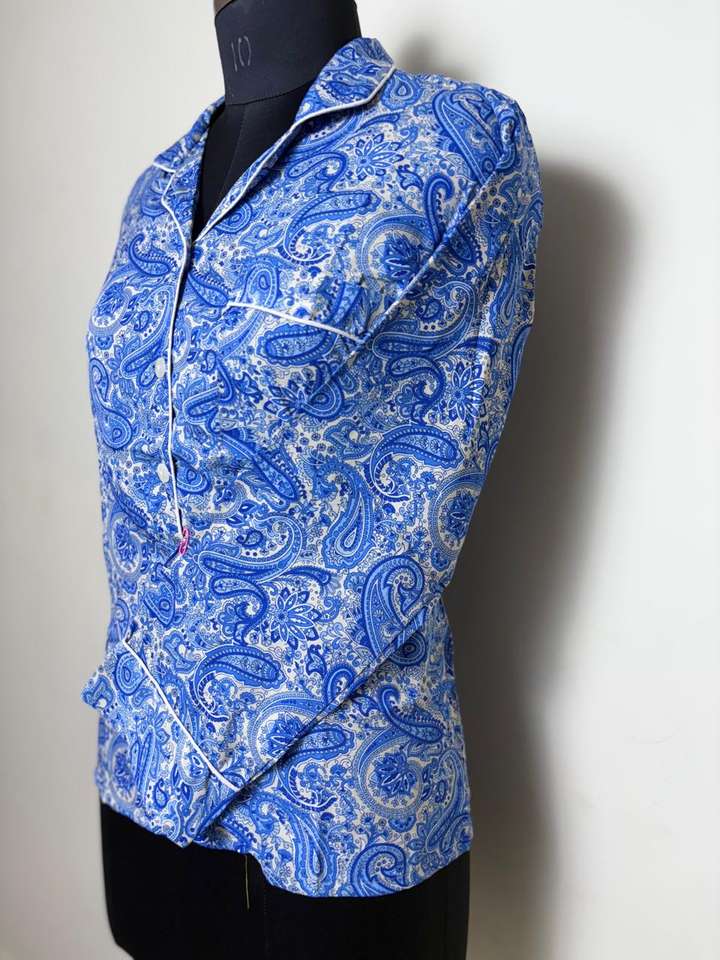 เสื้อเชิ้ตผ้าคอตตอนพิมพ์ลาย Paisley สำหรับผู้หญิงเสื้อลำลองมีกระดุมสีฟ้าและสีขาว