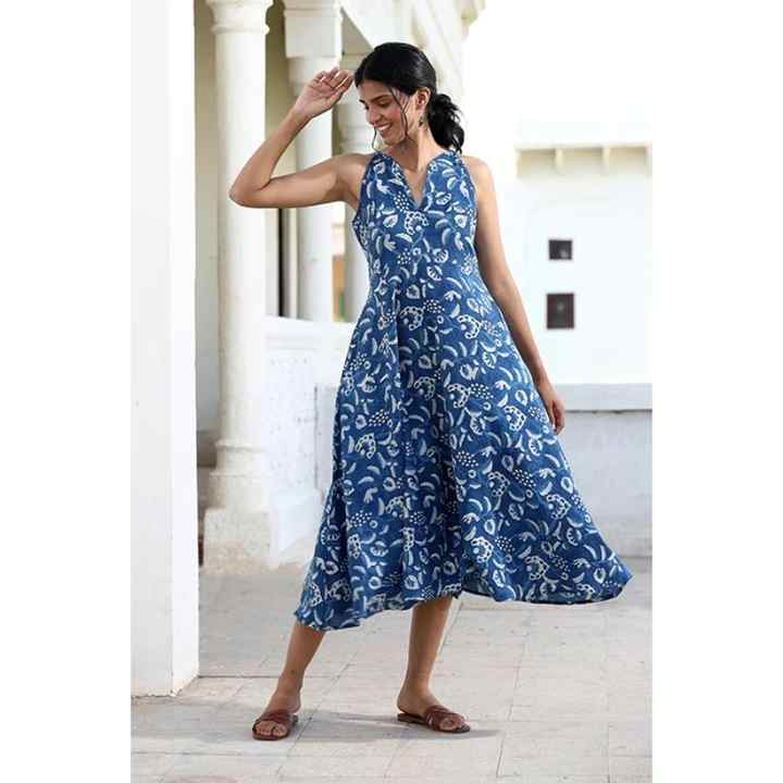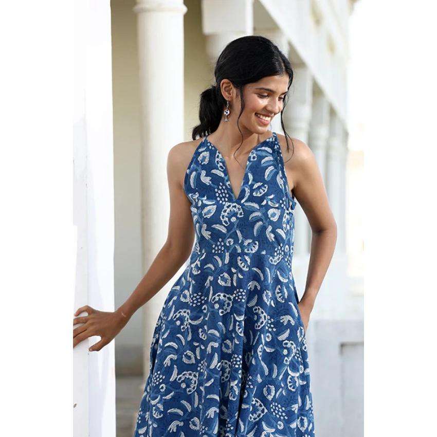 ชุดเดรสยาวปานกลางแขนกุดพิมพ์ลายสีฟ้าสำหรับผู้หญิงคอวีผ้าฝ้ายชุดลำลองฤดูร้อน