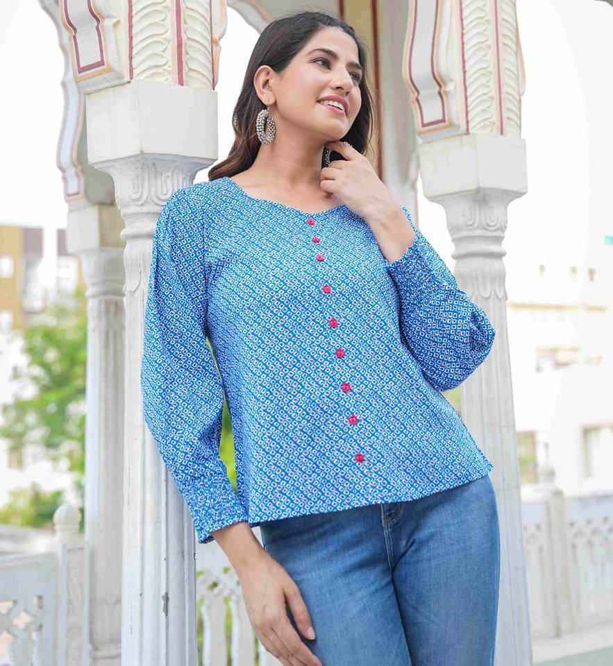 เสื้อท่อนบนทรงปกติสำหรับผู้หญิง สีฟ้า ผ้าเรยอน พิมพ์ลายเรขาคณิต แขนพอง คอวี ออกแบบมาเพื่อการสวมใส่ลำลองทุกวันในทั่วโลก