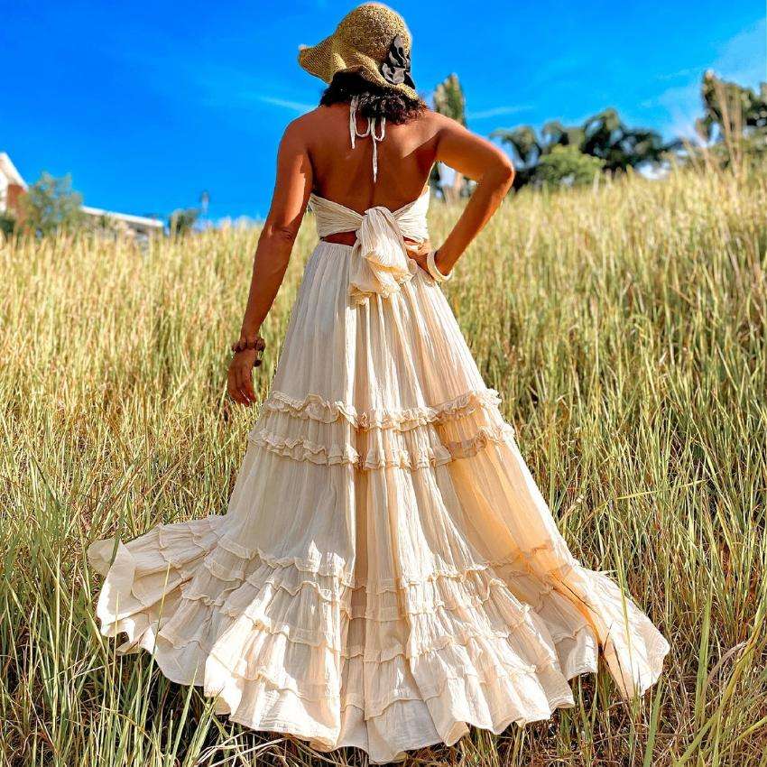 ชุดเดรสยาวสไตล์โบฮีเมียนสำหรับผู้หญิง แขนกุด คอวี ชายระบาย เหมาะสำหรับฤดูร้อน ชายหาด และวันหยุด