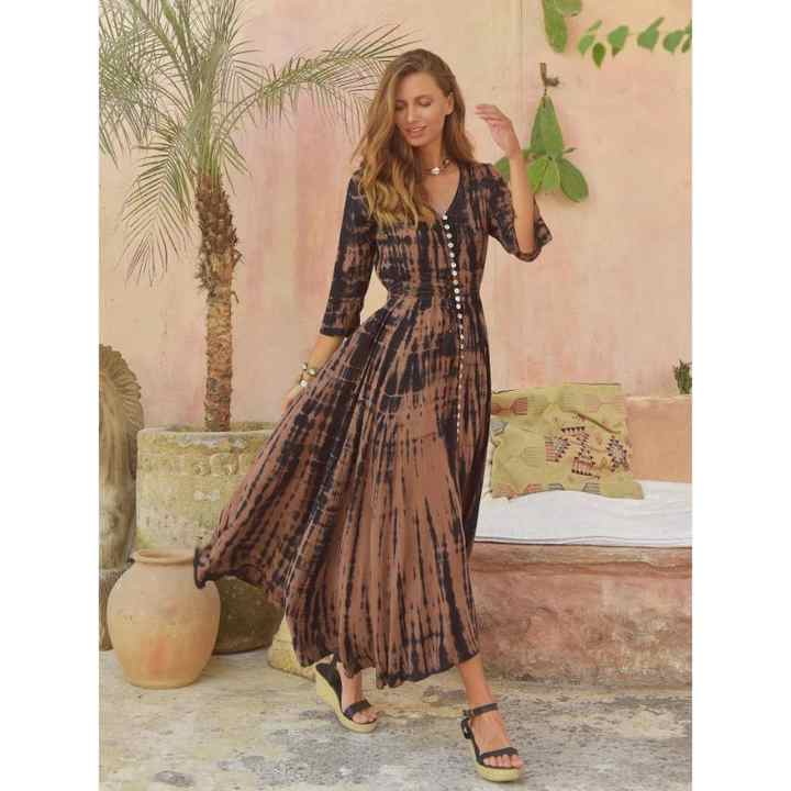 ชุดเดรสแม็กซี่ผ้ามัดย้อมสไตล์โบฮีเมียนสำหรับผู้หญิง คอวี ติดกระดุมด้านหน้า แขนยาว ชุดลำลองสำหรับฤดูร้อน
