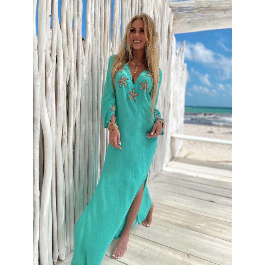 ชุดเดรสยาวปักลายสไตล์โบฮีเมียนสำหรับผู้หญิง คอวี แขนยาว สีเขียว เหมาะสำหรับวันหยุดพักผ่อนริมชายหาดในฤดูร้อน