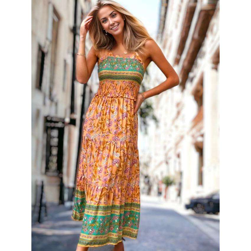 เดรสยาวพิมพ์ลายดอกไม้สไตล์โบฮีเมียนสำหรับผู้หญิง แบบไร้สายรัดไหล่ ไม่มีแขน วินเทจ เป็นมิตรกับสิ่งแวดล้อม ลำลอง ใส่ได้ในฤดูร้อน