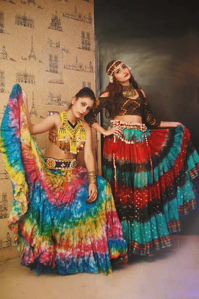 กระโปรงเต้นรำสไตล์โบฮีเมียนสำหรับผู้หญิง ลายมัดย้อมหลากสี กระโปรงยาวทรงบานสไตล์ชนเผ่า เหมาะสำหรับการแสดงระบำหน้าท้องและงานเทศกาล