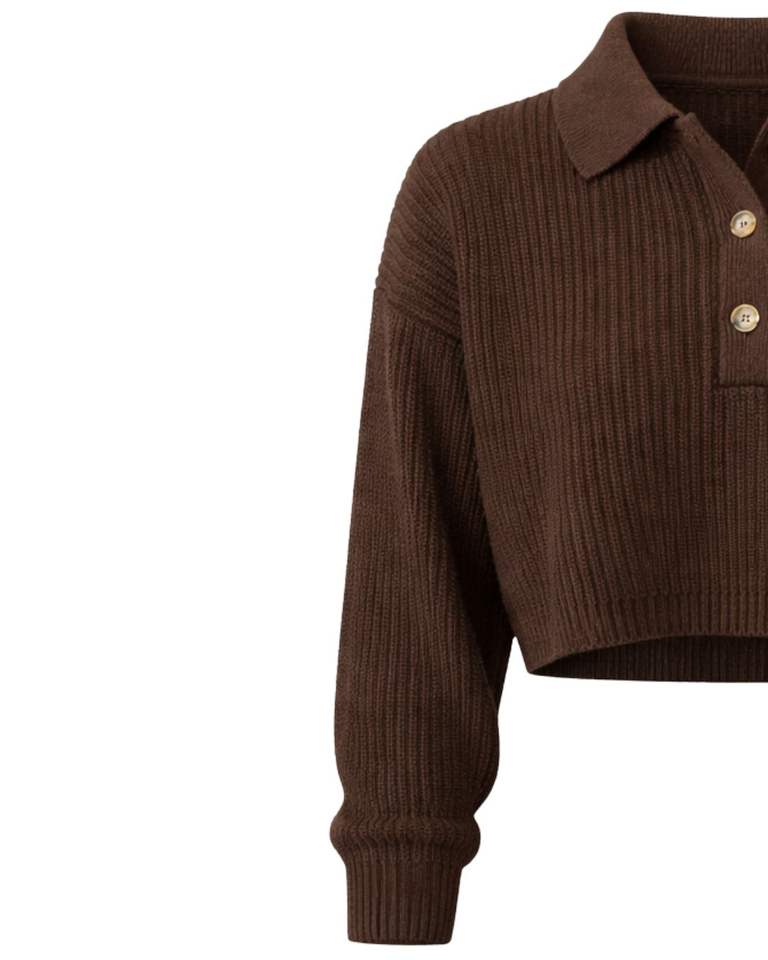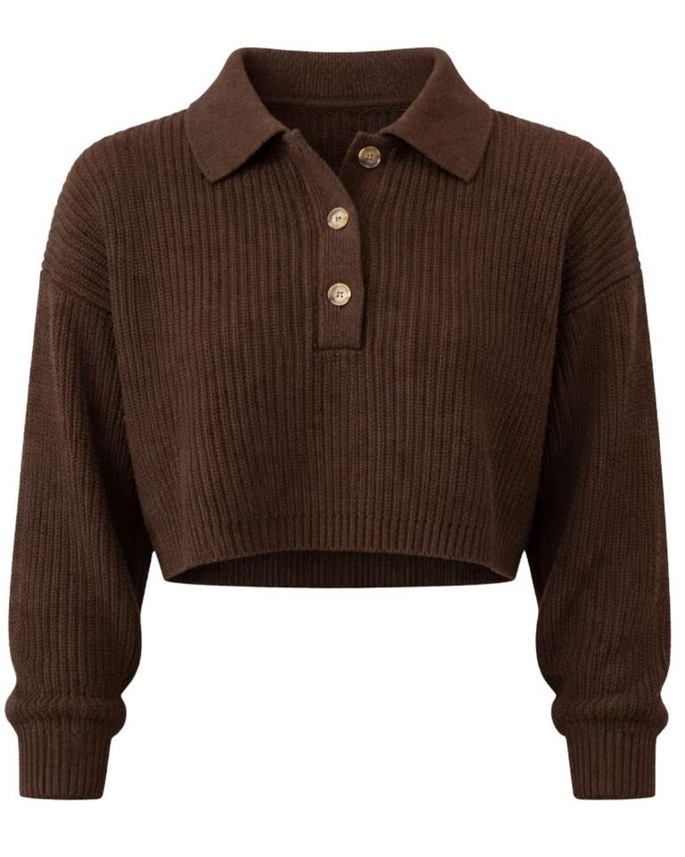 เสื้อสเวตเตอร์โปโลแขนยาวถักลายริบสีน้ำตาลสำหรับผู้หญิง ติดกระดุม ด้านหน้า ผ้านุ่ม ใส่สบาย เหมาะสำหรับฤดูหนาว แฟชั่นลำลอง ให้ความอบอุ่น