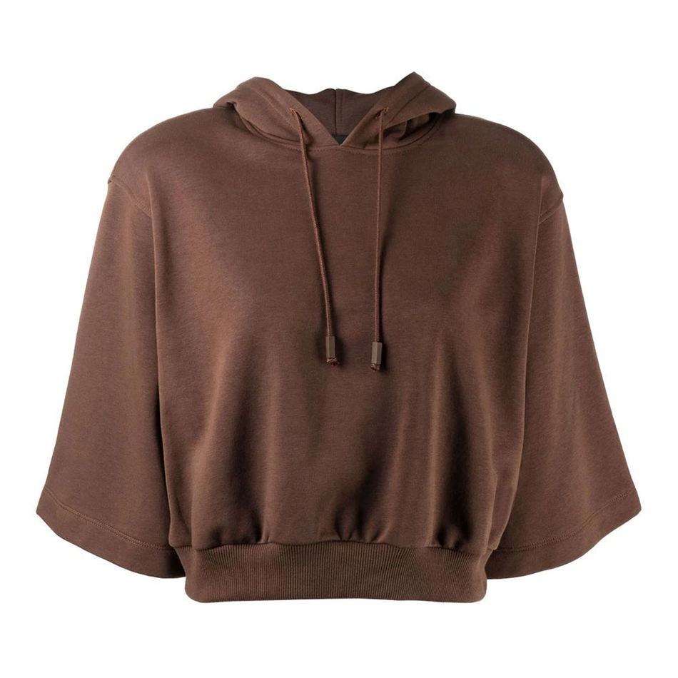 เสื้อฮู้ดครอปแขนสั้นสีน้ำตาลสำหรับผู้หญิง เสื้อสเวตเชิ้ตมีเชือกผูกแบบลำลอง