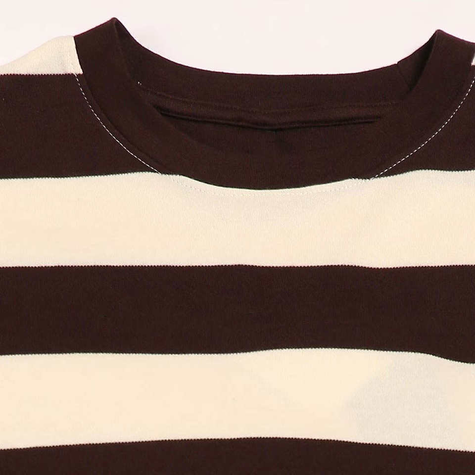 เสื้อยืดแขนสั้นลำลองสำหรับผู้หญิง สีน้ำตาลขาวลายทาง ผลิตจากโพลีเอสเตอร์/คอตตอน สำหรับฤดูร้อน ตกแต่งด้วยลายปักและดีไซน์รูซิป