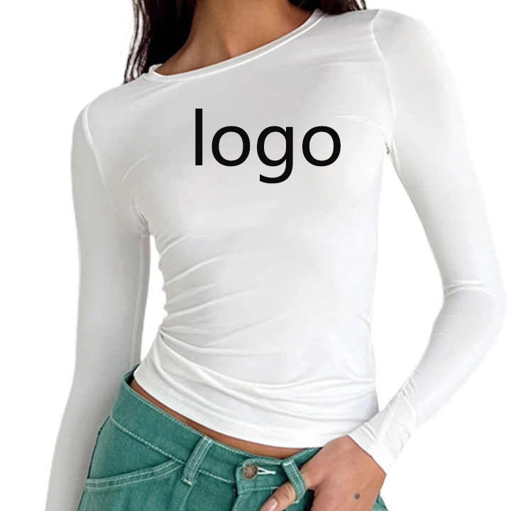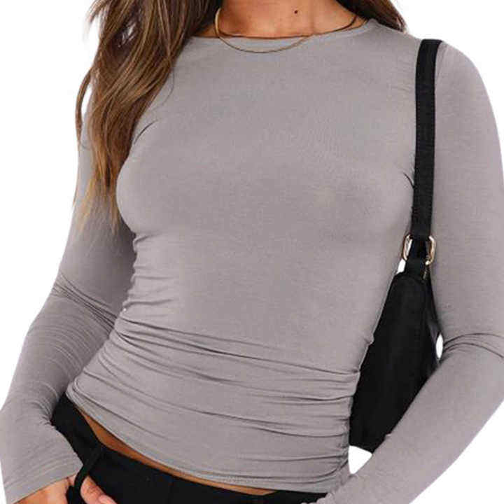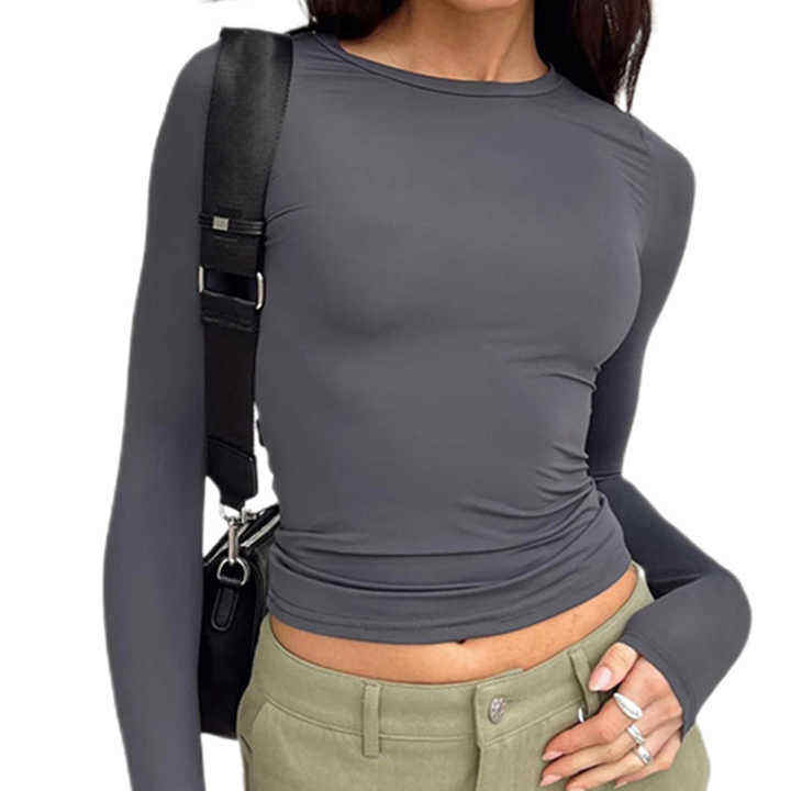 เสื้อยืดแขนยาวสำหรับผู้หญิงเสื้อยืดฟิตเนสแขนยาวเข้ารูปสีพื้น