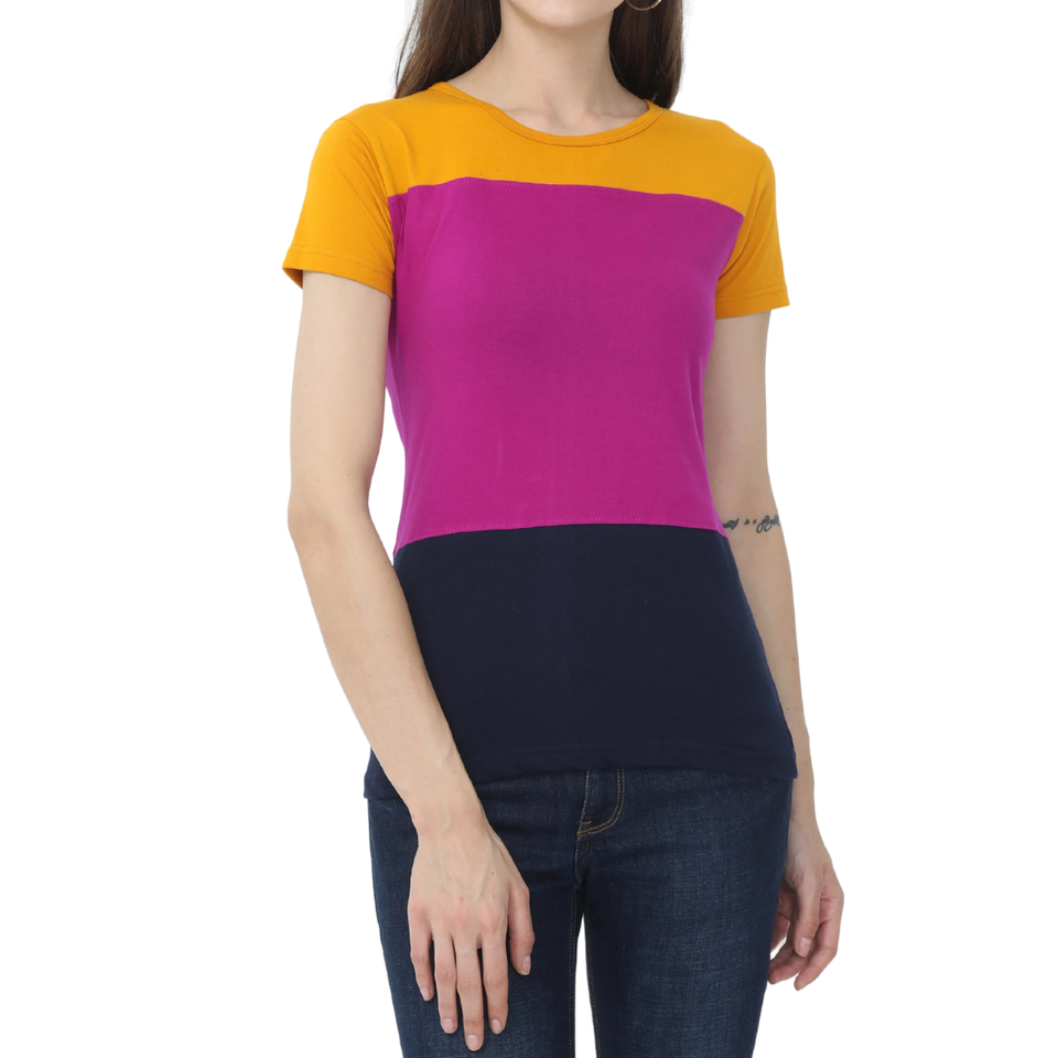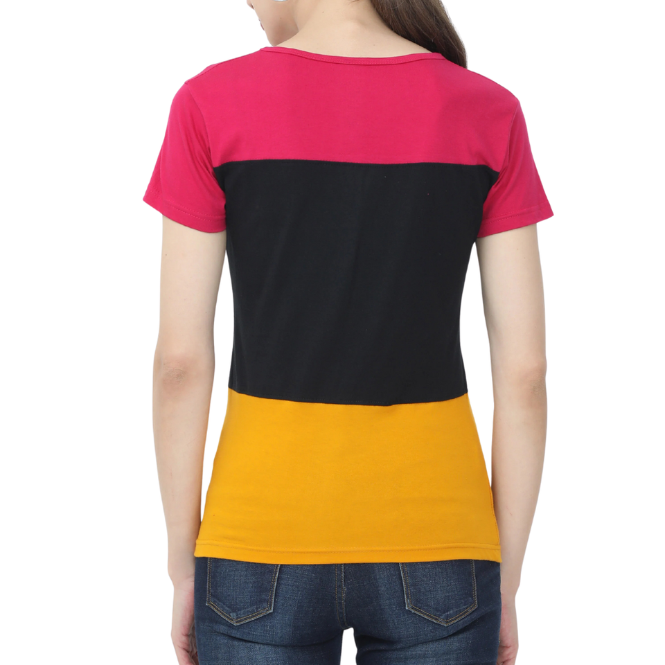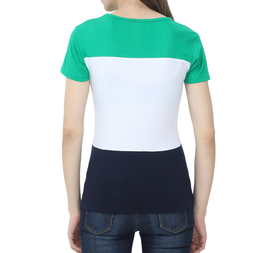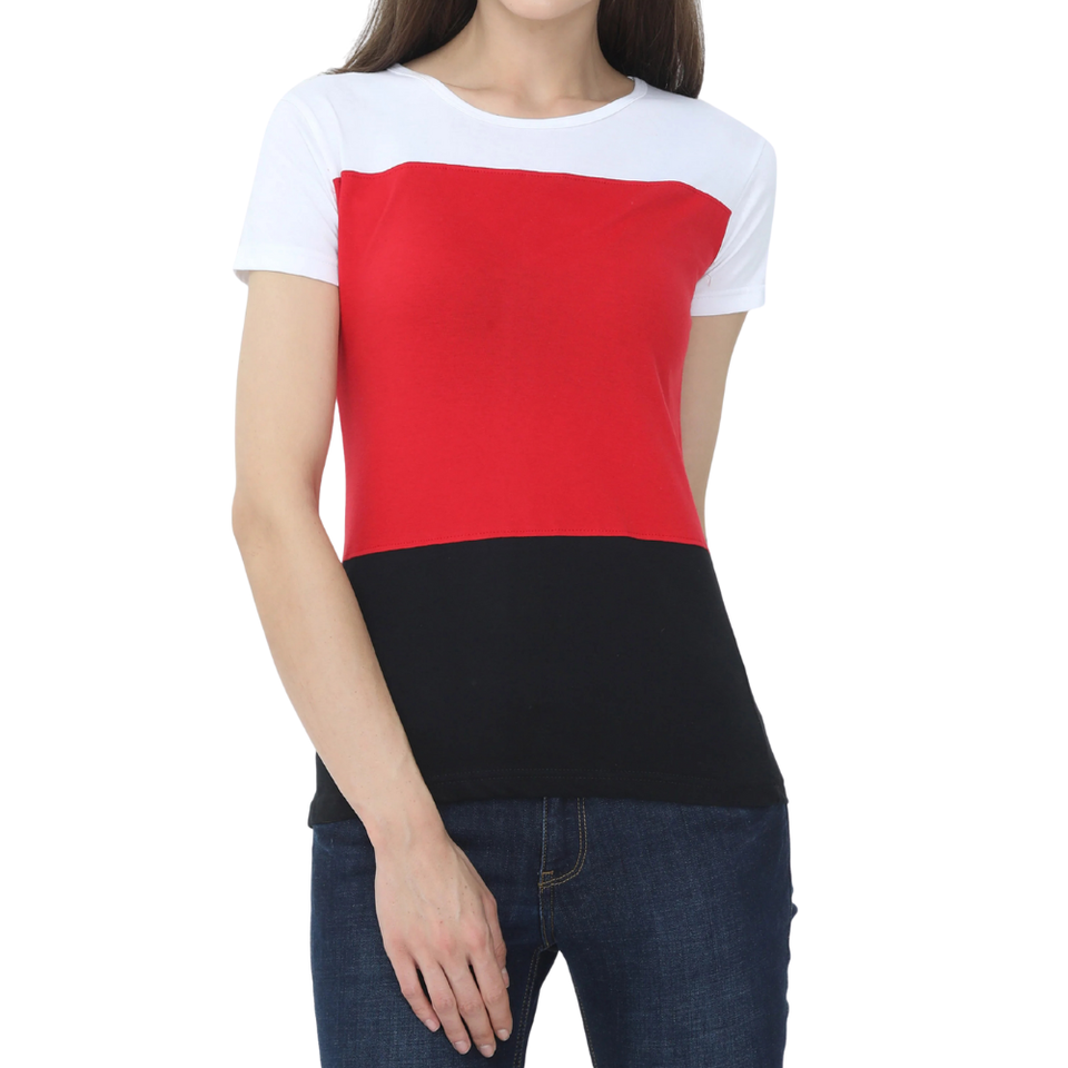 เสื้อยืดแขนสั้นคอกลมลำลองสำหรับผู้หญิง เสื้อยืดบล็อกสีแดง ขาว ดำ ทรงปกติสำหรับผู้หญิง ผ้าฝ้ายผสมสแปนเด็กซ์