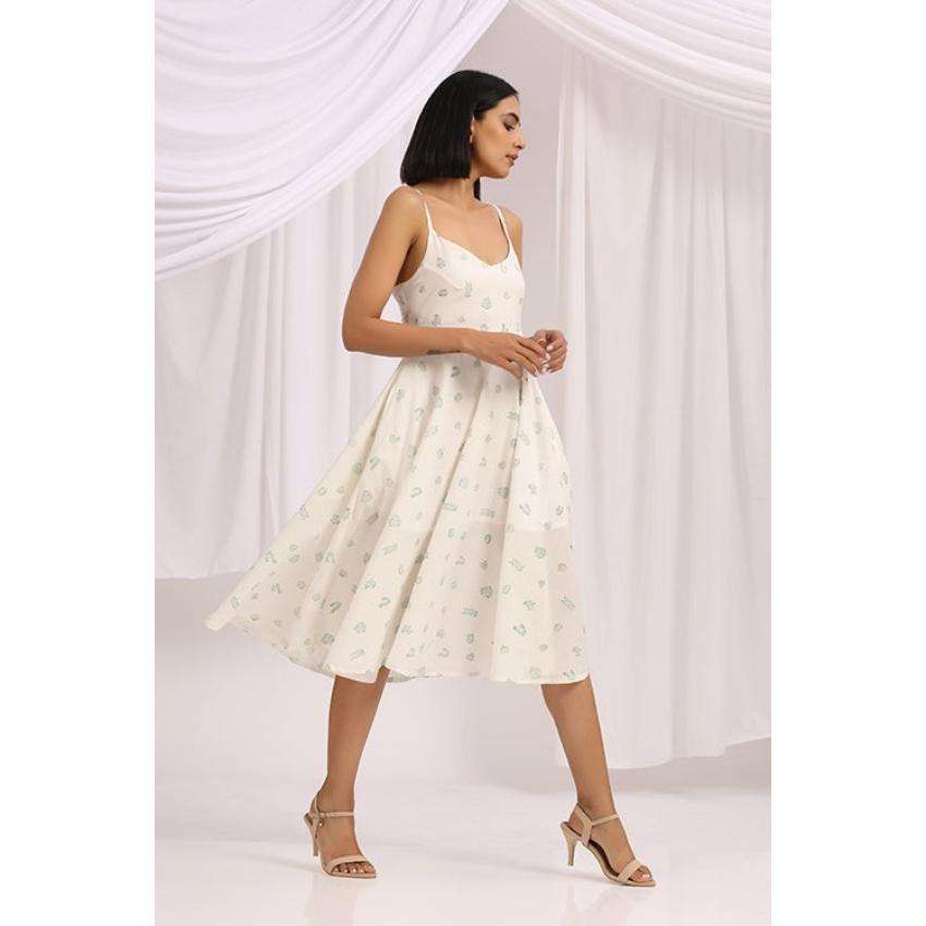 ชุดเดรสยาวปานกลางพิมพ์ลายสีครีมสำหรับผู้หญิง สายเดี่ยวแบบสปาเก็ตตี้ ชุดลำลองสำหรับฤดูร้อน