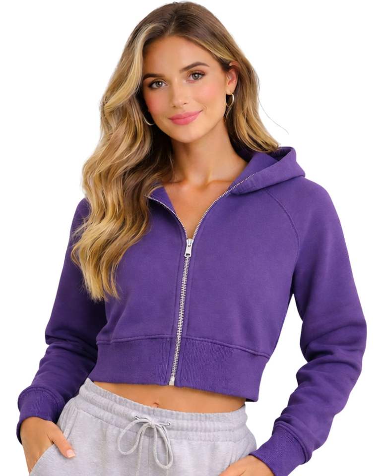 Womens Cropped Zip Up Hoodie Long Sleeve Casual Sweatshirt Soft Fleece Streetwear Purple Color Autumn Winter Fashion Wear