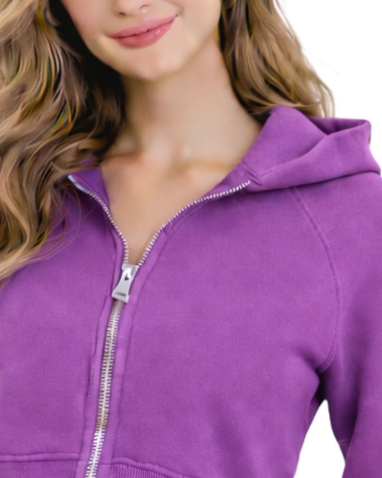 เสื้อฮู้ดครอปซิปหน้า แขนยาว สไตล์ลำลอง ผ้าฟลีซนุ่ม สีม่วงลาเวนเดอร์ แฟชั่นฤดูใบไม้ร่วงและฤดูหนาวสำหรับผู้หญิง