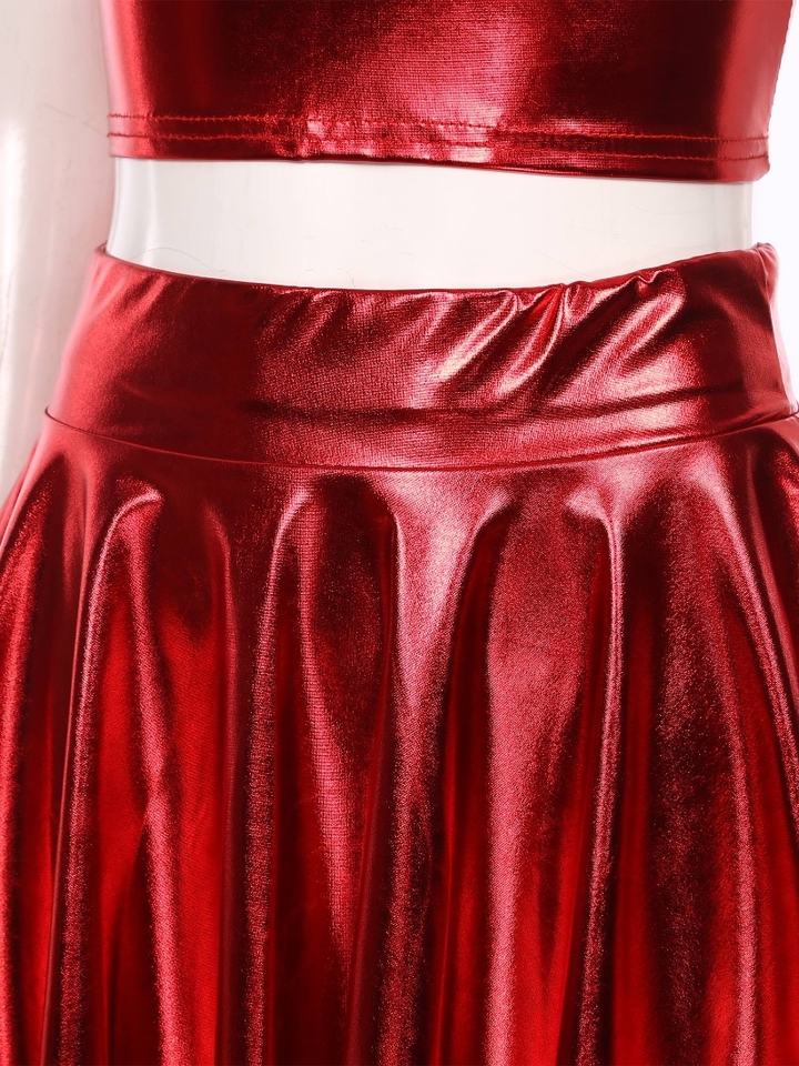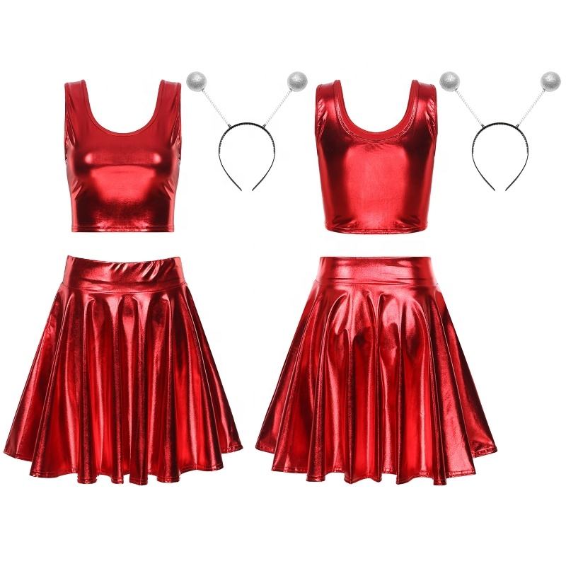 ชุดแสดงบนเวทีงานปาร์ตี้เต้นรำสำหรับผู้หญิง เสื้อครอปเมทัลลิกพร้อมกระโปรง ชุดที่คาดผมแบบตลกสำหรับธีมเอเลี่ยน